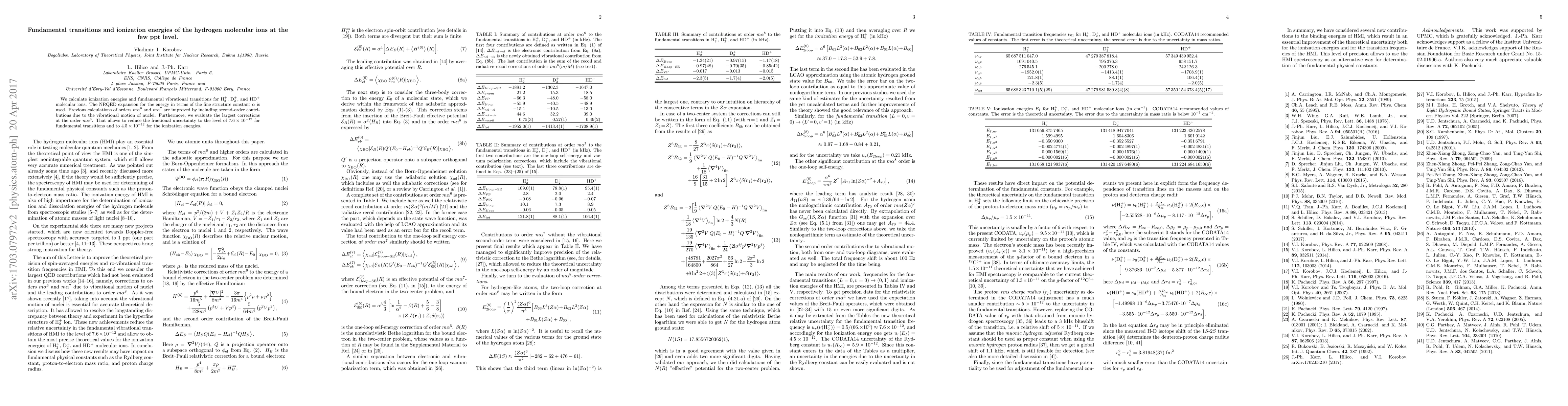 This paper calculates improved ionization energies and fundamental vibrational transitions for H$_2^+$, D$_2^+$, and HD$^+$ molecular ions using the NRQED expansion, including second-order contributions from nuclear vibrations and evaluating corrections up to $m\alpha^8$, achieving a fractional uncertainty of $7\cdot10^{-12}$ for transitions and $4\cdot10^{-12}$ for ionization energies.