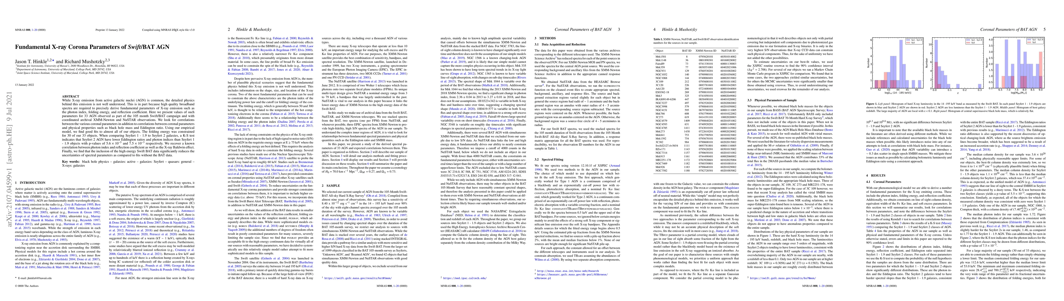 This study derives fundamental X-ray corona parameters for 33 AGN observed with Swift/BAT, complemented by XMM-Newton and NuSTAR data, revealing correlations between coronal parameters and physical properties. The inclusion of Swift BAT data significantly reduces uncertainties in spectral parameters.