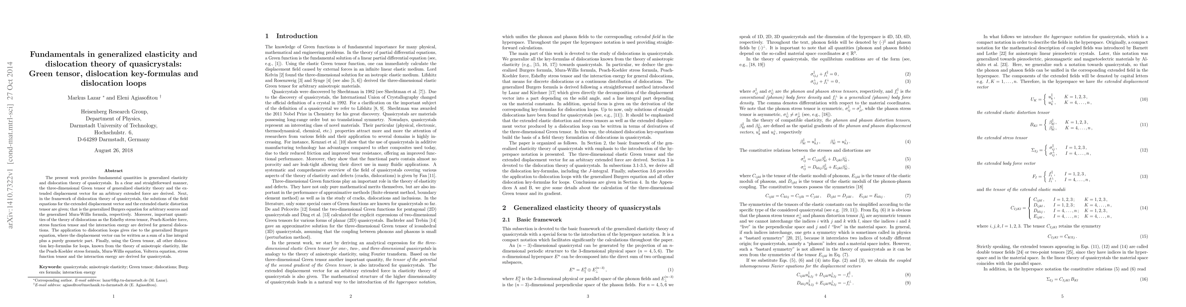 This paper derives fundamental quantities in generalized elasticity and dislocation theory for quasicrystals, including the three-dimensional Green tensor and extended displacement vector. It also provides solutions for dislocation loops, deriving key-formulas such as the Peach-Koehler stress formula and interaction energy for quasicrystals.