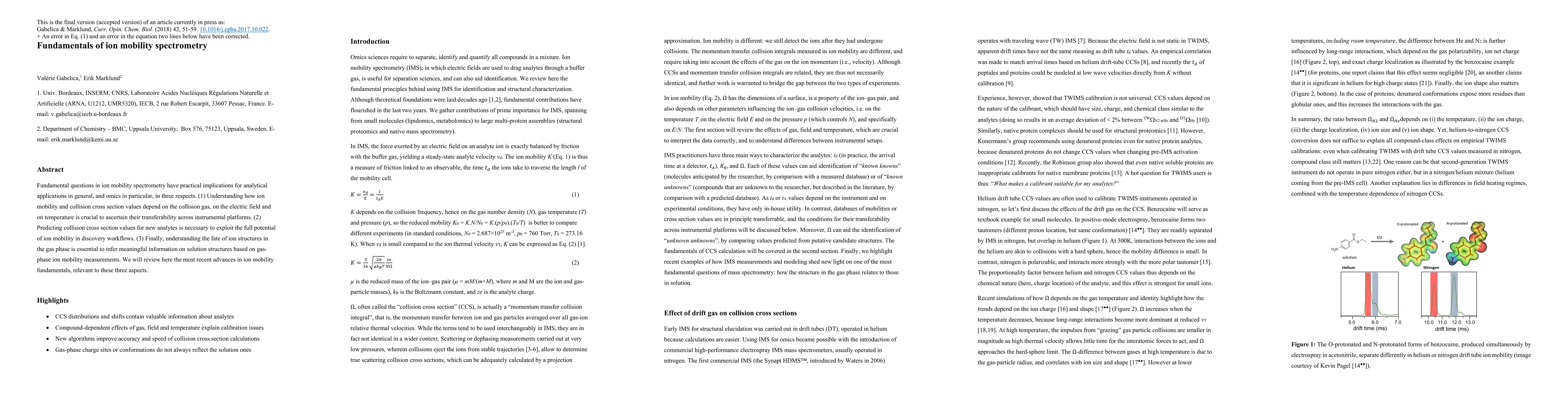 This paper reviews recent advances in ion mobility spectrometry, focusing on understanding the factors affecting ion mobility and collision cross section values, predicting these values for new analytes, and inferring solution structures from gas-phase measurements. The review highlights the importance of these fundamentals for analytical applications, especially in omics research.