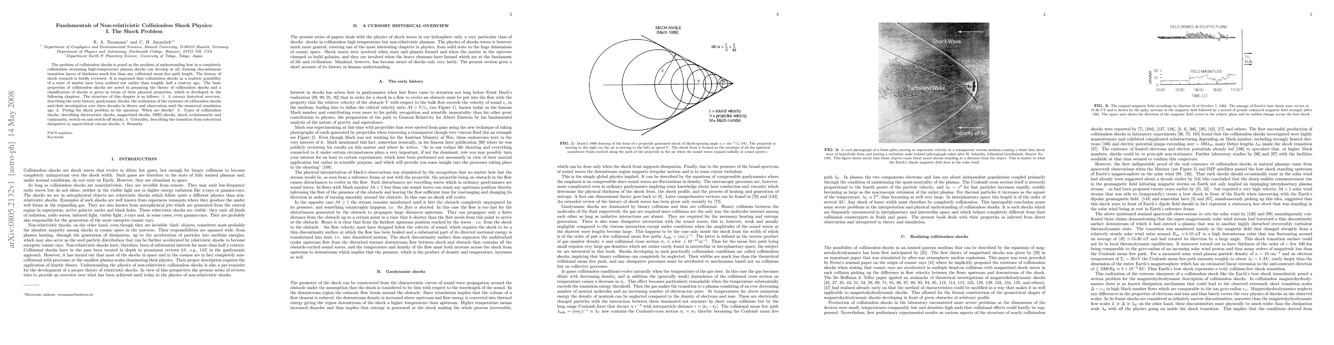 This paper reviews the history and fundamental properties of collisionless shocks in high-temperature plasmas, emphasizing their development without collisions and classifying them based on physical characteristics. It poses the shock problem as understanding when and how these shocks form, setting the stage for further theoretical exploration.