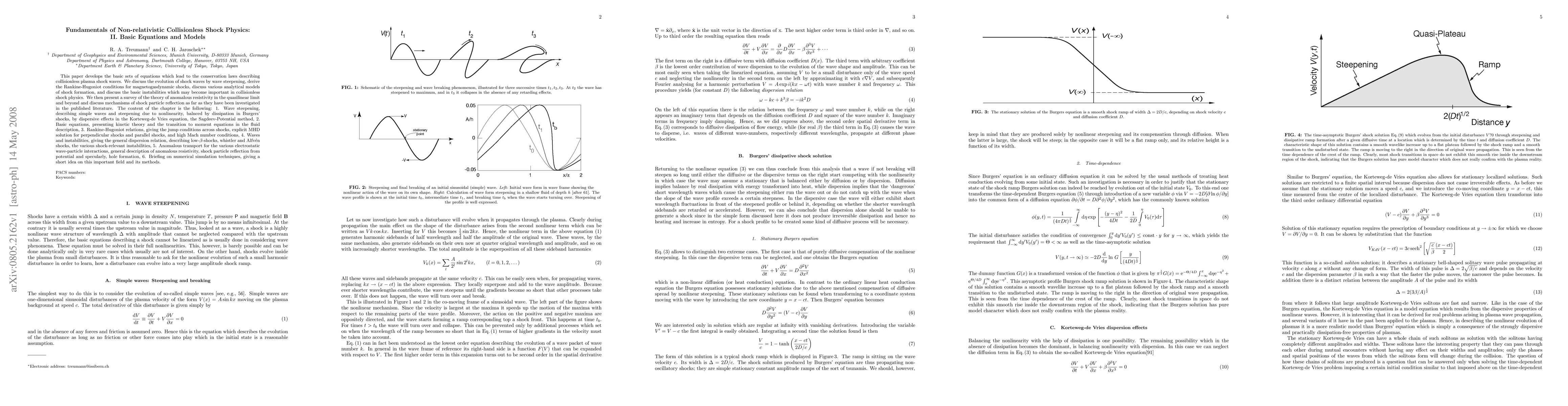 This paper develops fundamental equations and models for non-relativistic collisionless shock physics, focusing on wave steepening, Rankine-Hugoniot conditions, and shock instabilities. It also surveys theories of anomalous resistivity and shock particle reflection mechanisms.