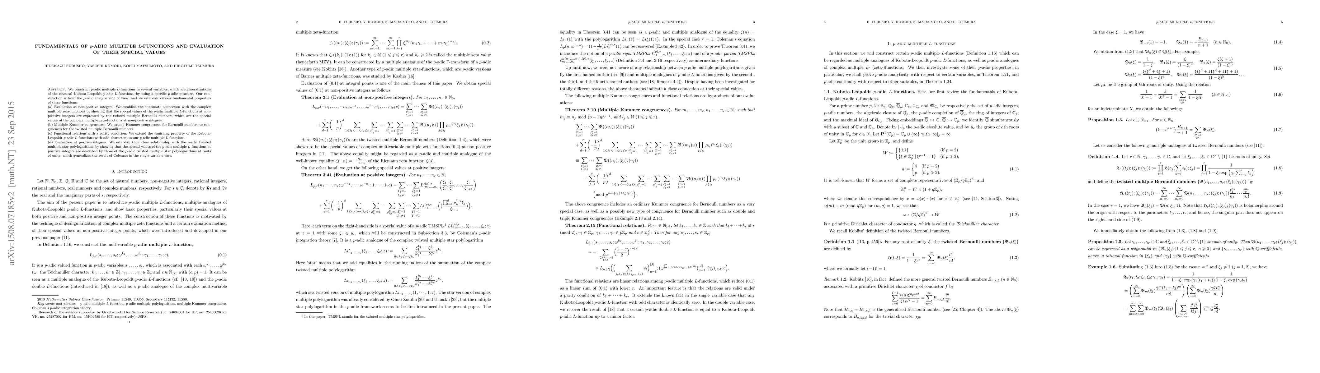 Summary: This paper constructs $p$-adic multiple $L$-functions as generalizations of classical Kubota-Leopoldt functions using a specific $p$-adic measure, and establishes fundamental properties from a $p$-adic analytic perspective.