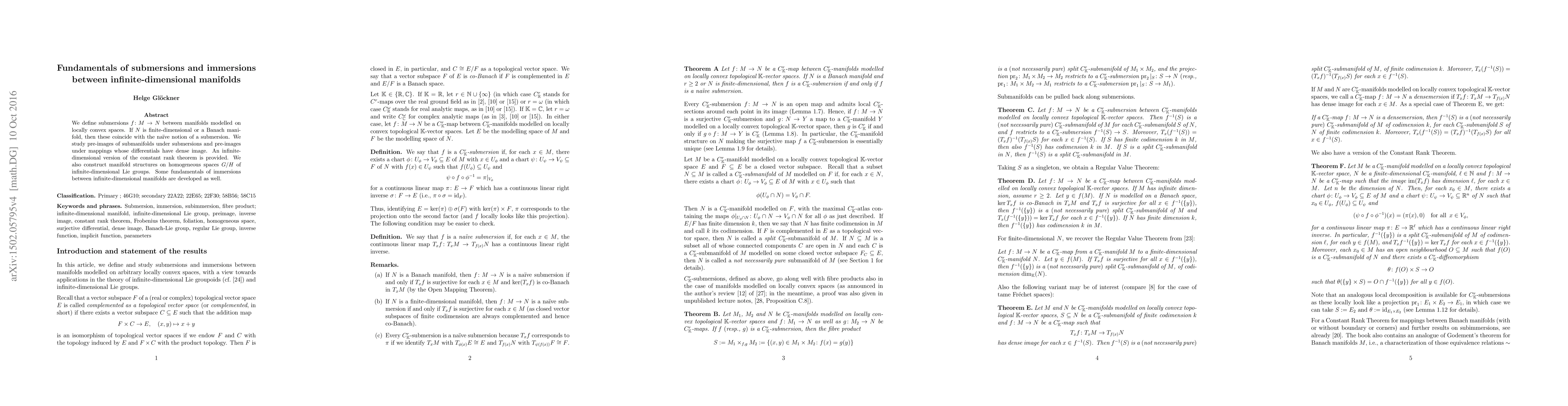 This paper defines submersions between infinite-dimensional manifolds modeled on locally convex spaces and explores their properties, including pre-images of submanifolds and an infinite-dimensional version of the constant rank theorem. It also constructs manifold structures on homogeneous spaces of infinite-dimensional Lie groups and develops fundamentals of immersions.