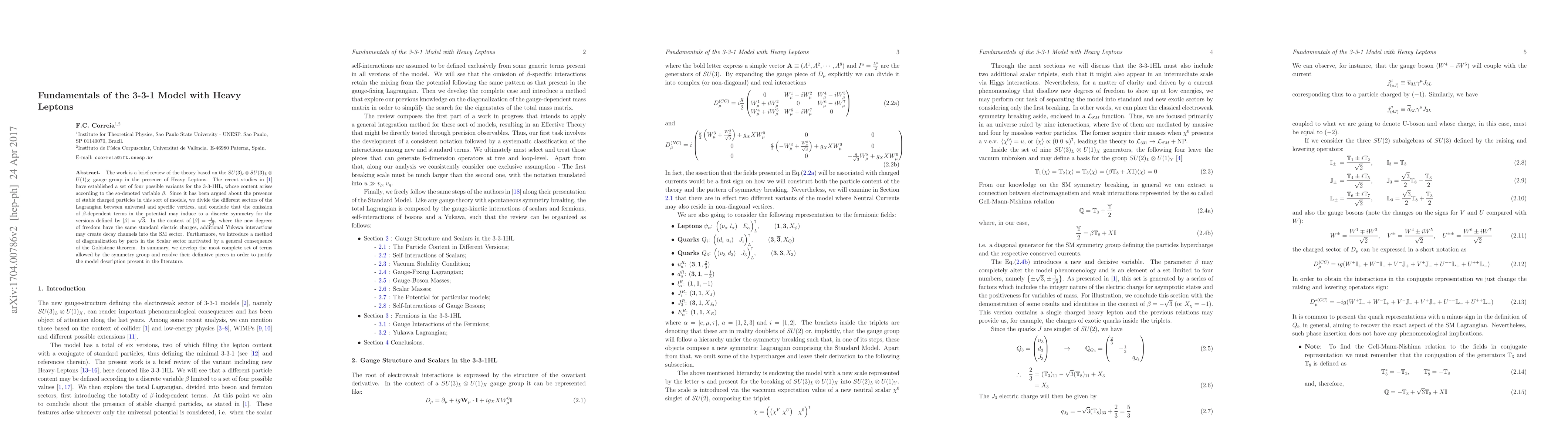Researchers review the 3-3-1 model with heavy leptons, exploring its variants and potential implications for particle stability and decay channels. They develop a comprehensive set of terms allowed by the symmetry group to justify the model's description.