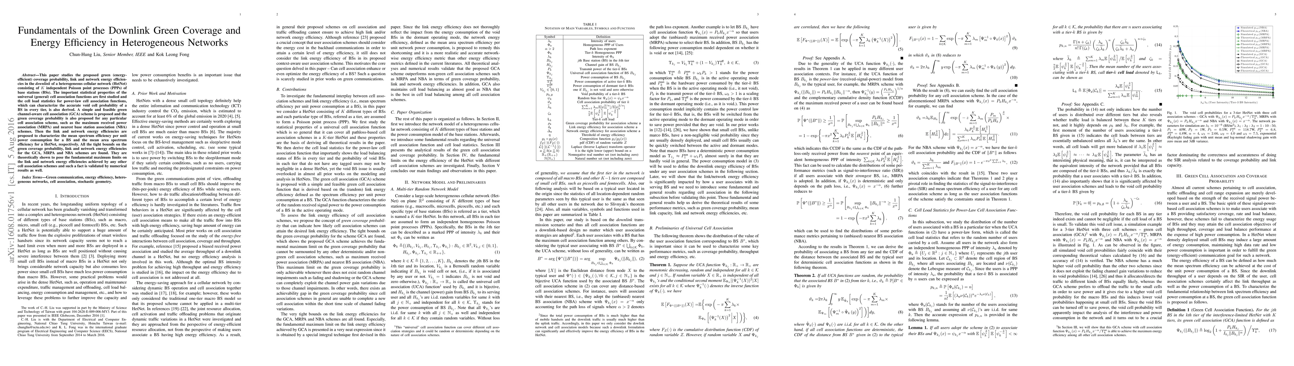 This paper studies the proposed green (energy-efficient) coverage probability, link and network energy efficiencies in the downlink of a heterogeneous cellular network (HetNet) consisting of $K$ independent Poisson point processes (PPPs) of base stations (BSs). The important statistical properties of the universal (general) cell association functions are first studied and the cell load statistics for power-law cell association functions, which can characterize the accurate void cell probability of a BS in every tier, is also derived. A simple and feasible green channel-aware cell association (GCA) scheme is proposed and the green coverage probability is also proposed for any particular cell association scheme, such as the maximum received power association (MRPA) and nearest base station association (NBA) schemes. Then the link and network energy efficiencies are proposed to characterize the mean spectrum efficiency per unit power consumption for a BS and the mean area spectrum efficiency for a HetNet, respectively. All the tight bounds on the green coverage probability, link and network energy efficiencies for the GCA, MRPA and NBA schemes are found. They are theoretically shown to pose the fundamental maximum limits on the link and network energy efficiencies achieved by any other cell association schemes and such a fact is validated by numerical results as well.