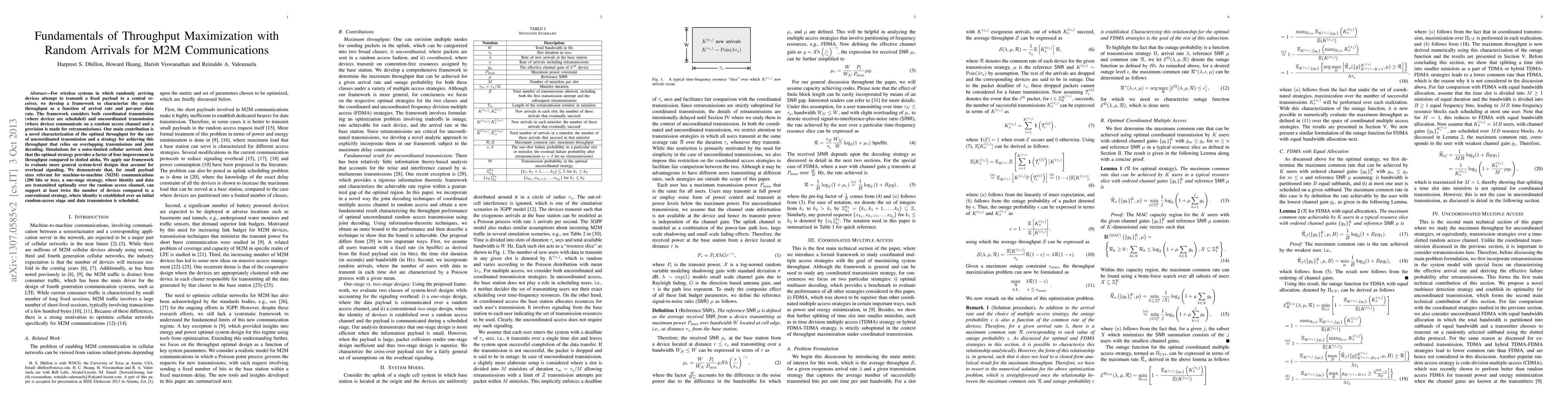 For wireless systems in which randomly arriving devices attempt to transmit a fixed payload to a central receiver, we develop a framework to characterize the system throughput as a function of arrival rate and per-user data rate. The framework considers both coordinated transmission (where devices are scheduled) and uncoordinated transmission (where devices communicate on a random access channel and a provision is made for retransmissions). Our main contribution is a novel characterization of the optimal throughput for the case of uncoordinated transmission and a strategy for achieving this throughput that relies on overlapping transmissions and joint decoding. Simulations for a noise-limited cellular network show that the optimal strategy provides a factor of four improvement in throughput compared to slotted aloha. We apply our framework to evaluate more general system-level designs that account for overhead signaling. We demonstrate that, for small payload sizes relevant for machine-to-machine (M2M) communications (200 bits or less), a one-stage strategy, where identity and data are transmitted optimally over the random access channel, can support at least twice the number of devices compared to a conventional strategy, where identity is established over an initial random-access stage and data transmission is scheduled.