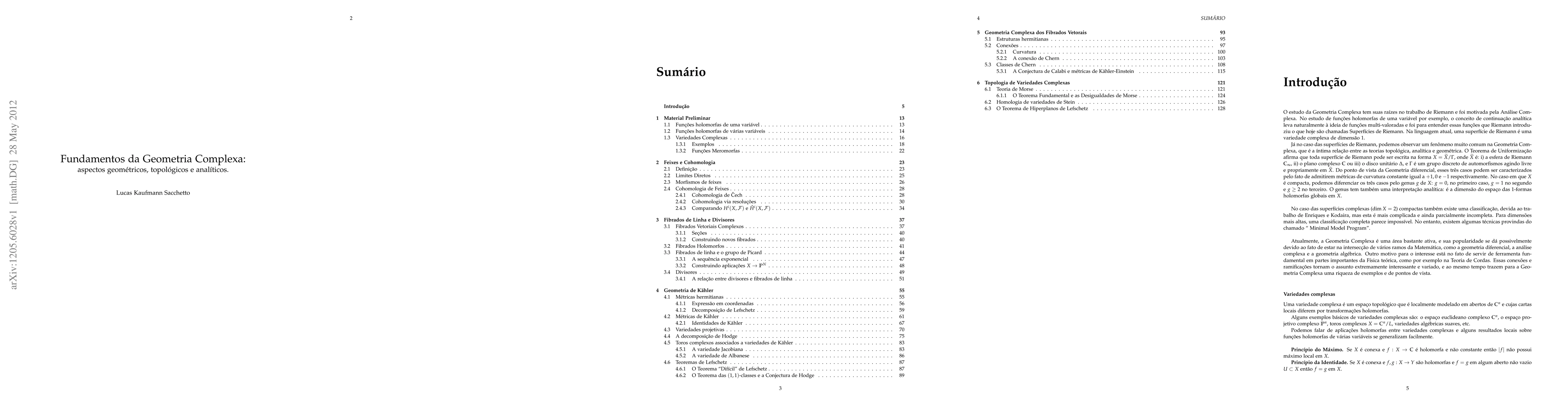 The main goal of this work is to present a detailed study of the foundations of Complex Geometry, highlighting its geometrical, topological and analytical aspects. Beginning with a preliminary material, such as the basic results on holomorphic functions in one or more variables and the definition and first examples of a complex manifold, we move on to an introduction to sheaf theory and its cohomology, an essential tool to the rest of the work. After a discussion on divisors and line bundles we turn attention to K\"ahler Geometry and its central results, such as the Hodge Decomposition Theorem, the Hard Lefschetz Theorem and the Lefschetz Theorem on $(1,1)$-classes. After that, we study complex vector bundles and its geometry, focusing on the concepts of connections, curvature and Chern classes. Finally, we finish by describing some aspects of the topology of complex manifolds, such as the Lefschetz Hyperplane Theorem and some of its consequences.