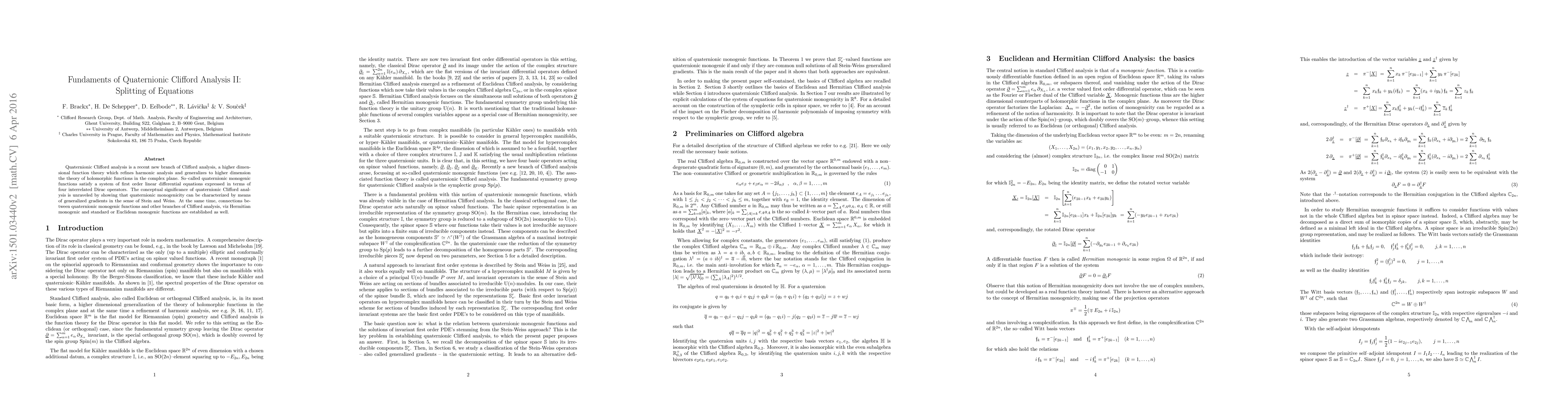 Quaternionic Clifford analysis is a recent new branch of Clifford analysis, a higher dimensional function theory which refines harmonic analysis and generalizes to higher dimension the theory of holomorphic functions in the complex plane. So-called quaternionic monogenic functions satisfy a system of first order linear differential equations expressed in terms of four interrelated Dirac operators. The conceptual significance of quaternionic Clifford analysis is unraveled by showing that quaternionic monogenicity can be characterized by means of generalized gradients in the sense of Stein and Weiss. At the same time, connections between quaternionic monogenic functions and other branches of Clifford analysis, viz Hermitian monogenic and standard or Euclidean monogenic functions are established as well.