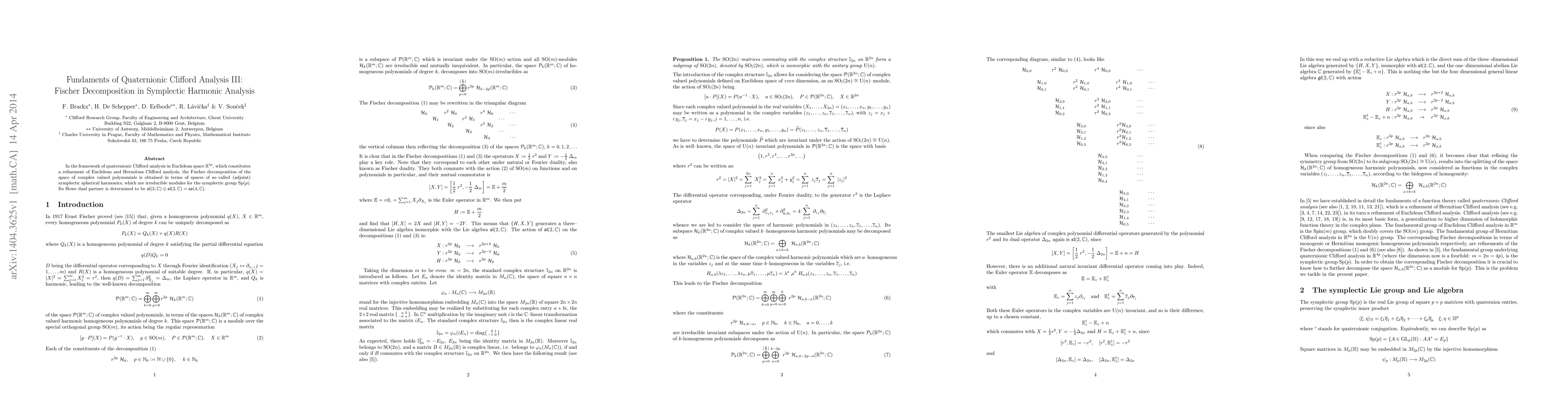 This paper explores the Fischer decomposition of complex valued polynomials in quaternionic Clifford analysis within $\mathbb{R}^{4p}$, identifying them with adjoint symplectic spherical harmonics. It determines their Howe dual partner as $\mathfrak{sl}(2,\mathbb{C}) \oplus \mathfrak{sl}(2,\mathbb{C}) = \mathfrak{so}(4,\mathbb{C})$.