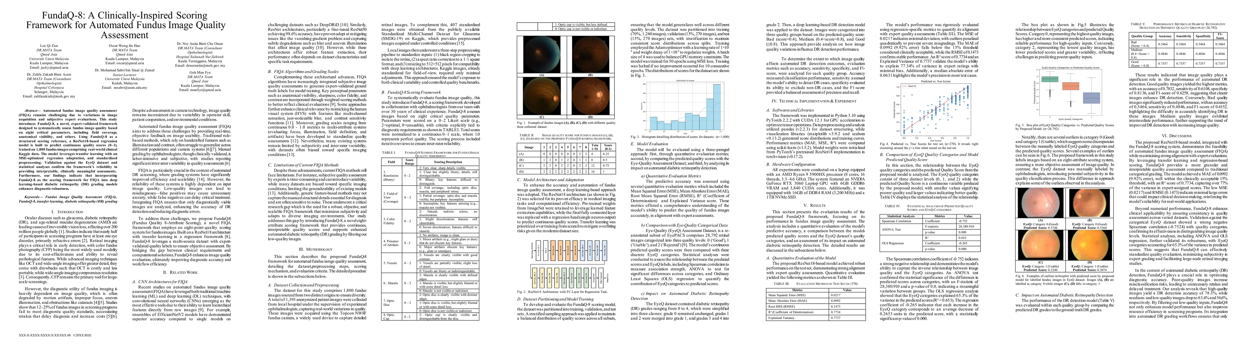 The study introduces FundaQ-8, an expert-validated framework for assessing fundus image quality using eight parameters. A ResNet18-based regression model predicts continuous quality scores in the 0 to 1 range, trained on 1800 fundus images from clinical and Kaggle sources using transfer learning and mean squared error optimization.