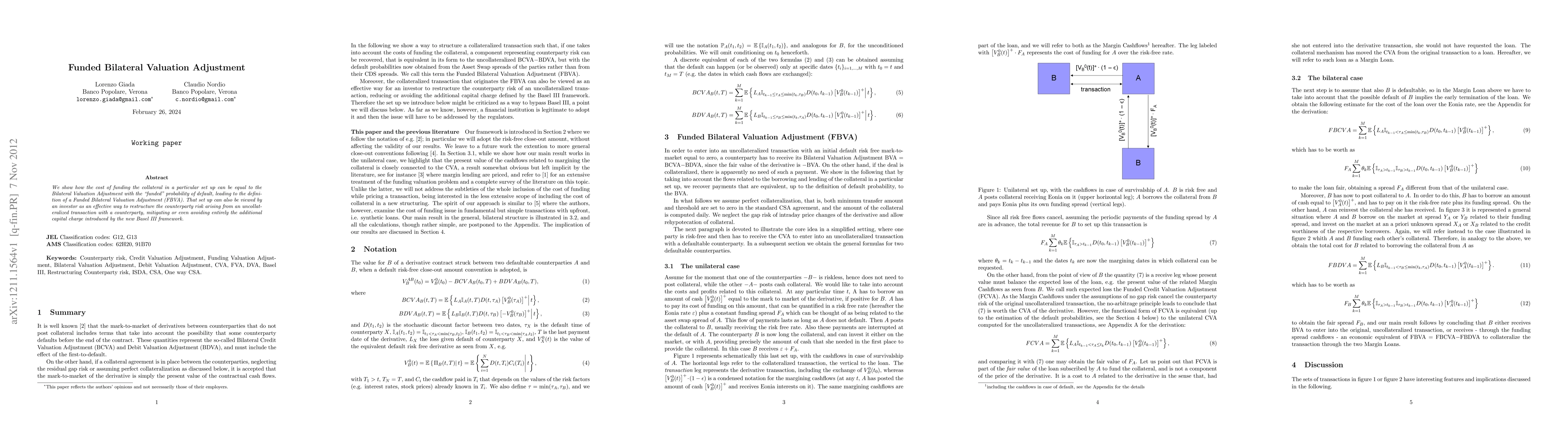 The research introduces Funded Bilateral Valuation Adjustment (FBVA), demonstrating its equivalence to the funding cost of collateral in a specific setup. This method can help investors restructure counterparty risk from uncollateralized transactions, potentially avoiding additional capital charges under Basel III framework.