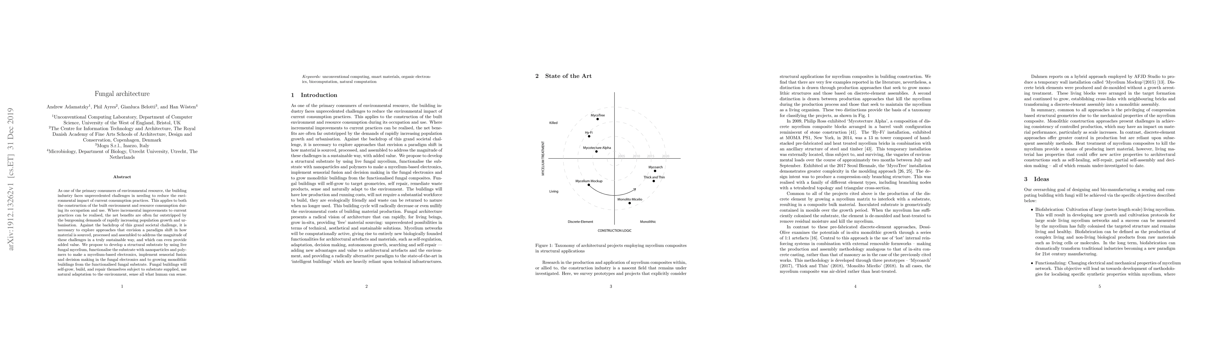 As one of the primary consumers of environmental resource, the building industry faces unprecedented challenges in needing to reduce the environmental impact of current consumption practices. This applies to both the construction of the built environment and resource consumption during its occupation and use. Where incremental improvements to current practices can be realised, the net benefits are often far outstripped by the burgeoning demands of rapidly increasing population growth and urbanisation. Against the backdrop of this grand societal challenge, it is necessary to explore approaches that envision a paradigm shift in how material is sourced, processed and assembled to address the magnitude of these challenges in a truly sustainable way, and which can even provide added value. We propose to develop a structural substrate by using live fungal mycelium, functionalise the substrate with nanoparticles and polymers to make a mycelium-based electronics, implement sensorial fusion and decision making in the fungal electronics and to growing monolithic buildings from the functionalised fungal substrate. Fungal buildings will self-grow, build, and repair themselves subject to substrate supplied, use natural adaptation to the environment, sense all what human can sense.