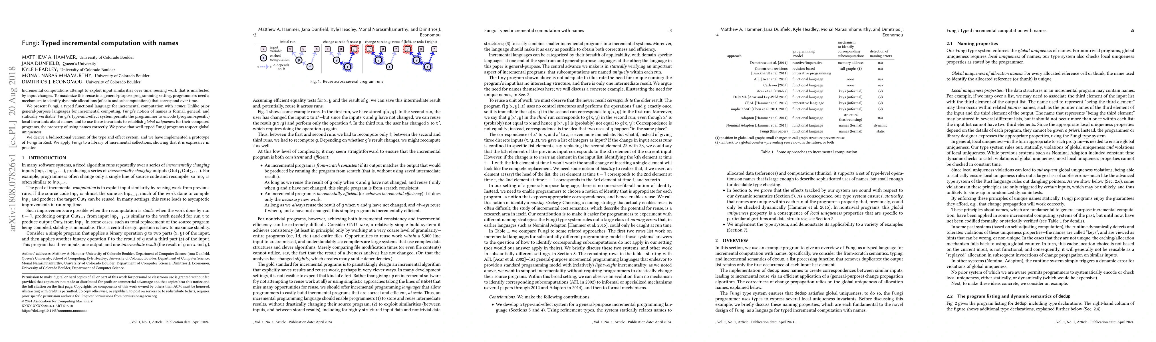 Fungi is a typed functional language designed for incremental computation, featuring a formal, general, and statically verifiable notion of names to identify dynamic allocations over time. The language's type-and-effect system enables programmers to encode local invariants, ensuring global uniqueness in composed programs, which is proven to be respected by well-typed Fungi programs.