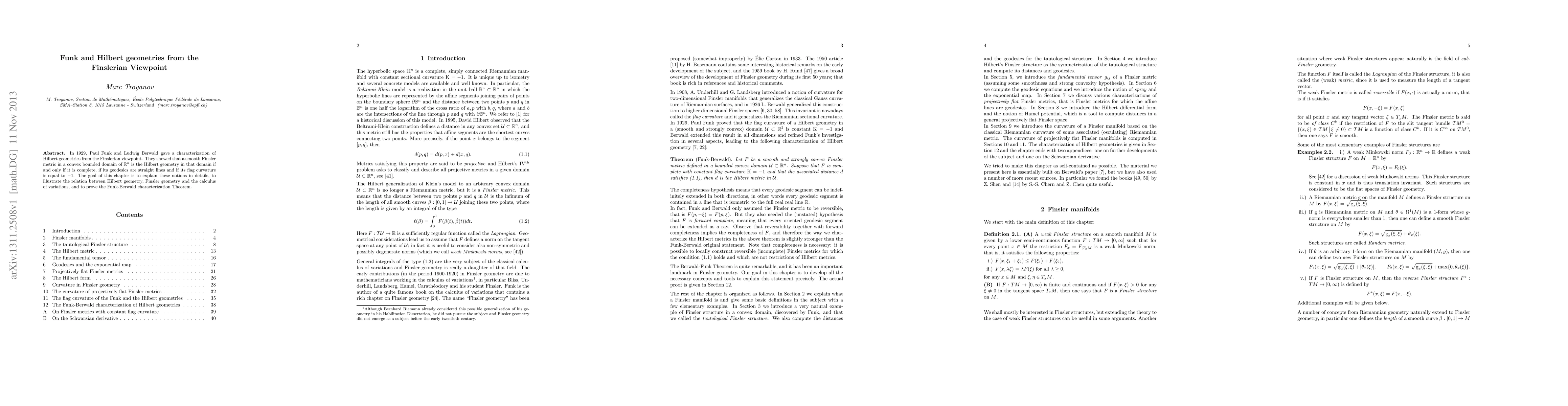 In 1929, Paul Funk and Ludwig Berwald gave a characterization of Hilbert geometries from the Finslerian viewpoint. They showed that a smooth Finsler metric in a convex bounded domain of $\mathbb{R}^n$ is the Hilbert geometry in that domain if and only if it is complete, if its geodesics are straight lines and if its flag curvature is equal to -1. The goal of this chapter is to explain these notions in details, to illustrate the relation between Hilbert geometry, Finsler geometry and the calculus of variations, and to prove the Funk-Berwald characterization Theorem.