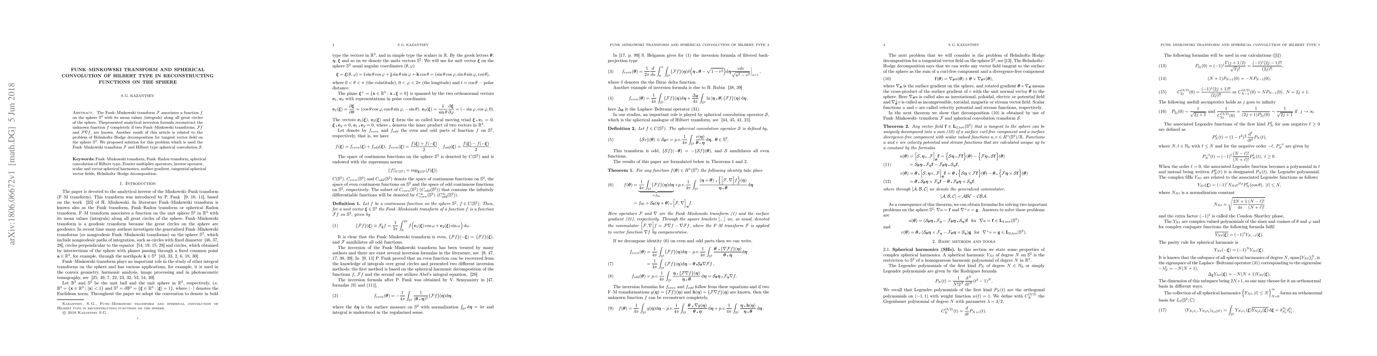 The Funk--Minkowski transform ${\mathcal F}$ associates a function $f$ on the sphere ${\mathbb S}^2$ with its mean values (integrals) along all great circles of the sphere. Thepresented analytical inversion formula reconstruct the unknown function $f$ completely if two Funk--Minkowski transforms, ${\mathcal F}f$ and ${\mathcal F} \nabla f$, are known. Another result of this article is related to the problem of Helmholtz--Hodge decomposition for tangent vector field on the sphere ${\mathbb S}^2$. We proposed solution for this problem which is used the Funk-Minkowski transform ${\mathcal F}$ and Hilbert type spherical convolution ${\mathcal S}$.