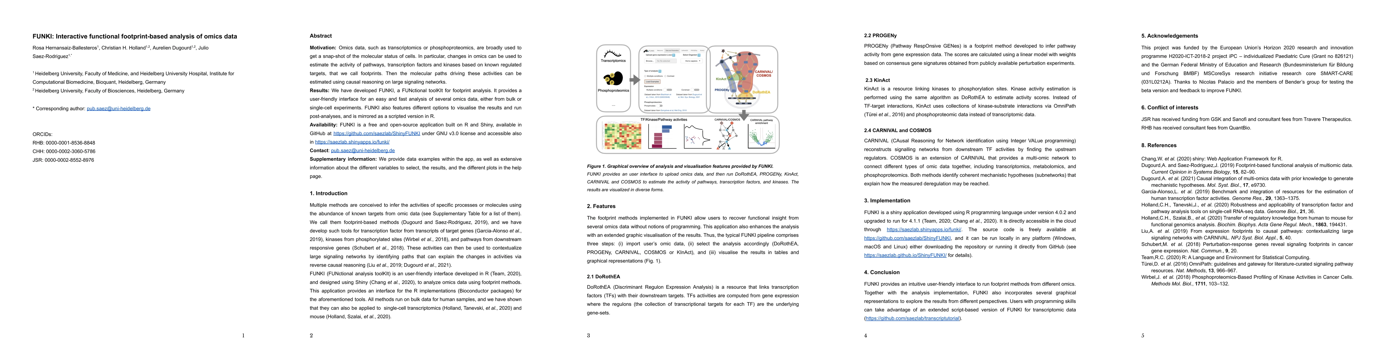 Motivation: Omics data, such as transcriptomics or phosphoproteomics, are broadly used to get a snap-shot of the molecular status of cells. In particular, changes in omics can be used to estimate the activity of pathways, transcription factors and kinases based on known regulated targets, that we call footprints. Then the molecular paths driving these activities can be estimated using causal reasoning on large signaling networks. Results: We have developed FUNKI, a FUNctional toolKIt for footprint analysis. It provides a user-friendly interface for an easy and fast analysis of several omics data, either from bulk or single-cell experiments. FUNKI also features different options to visualise the results and run post-analyses, and is mirrored as a scripted version in R. Availability: FUNKI is a free and open-source application built on R and Shiny, available in GitHub at https://github.com/saezlab/ShinyFUNKI under GNU v3.0 license and accessible also in https://saezlab.shinyapps.io/funki/ Contact: [email protected] Supplementary information: We provide data examples within the app, as well as extensive information about the different variables to select, the results, and the different plots in the help page.