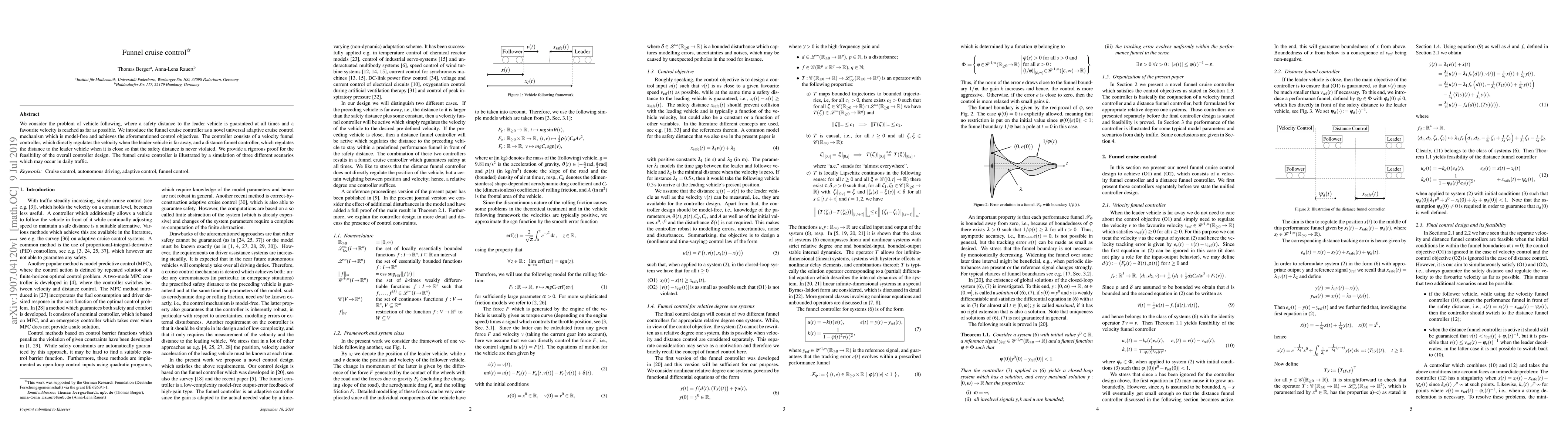 The funnel cruise control is a novel adaptive mechanism ensuring safety distance and preferred velocity in vehicle following. It combines a velocity funnel controller for distant leaders and a distance funnel controller for close ones, validated through rigorous proofs and simulations in various traffic scenarios.