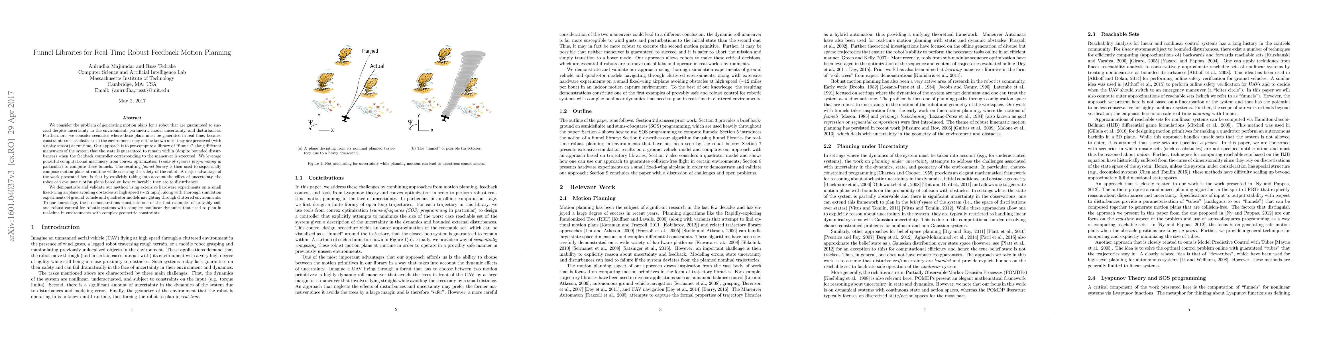We consider the problem of generating motion plans for a robot that are guaranteed to succeed despite uncertainty in the environment, parametric model uncertainty, and disturbances. Furthermore, we consider scenarios where these plans must be generated in real-time, because constraints such as obstacles in the environment may not be known until they are perceived (with a noisy sensor) at runtime. Our approach is to pre-compute a library of "funnels" along different maneuvers of the system that the state is guaranteed to remain within (despite bounded disturbances) when the feedback controller corresponding to the maneuver is executed. We leverage powerful computational machinery from convex optimization (sums-of-squares programming in particular) to compute these funnels. The resulting funnel library is then used to sequentially compose motion plans at runtime while ensuring the safety of the robot. A major advantage of the work presented here is that by explicitly taking into account the effect of uncertainty, the robot can evaluate motion plans based on how vulnerable they are to disturbances. We demonstrate and validate our method using extensive hardware experiments on a small fixed-wing airplane avoiding obstacles at high speed (~12 mph), along with thorough simulation experiments of ground vehicle and quadrotor models navigating through cluttered environments. To our knowledge, these demonstrations constitute one of the first examples of provably safe and robust control for robotic systems with complex nonlinear dynamics that need to plan in real-time in environments with complex geometric constraints.