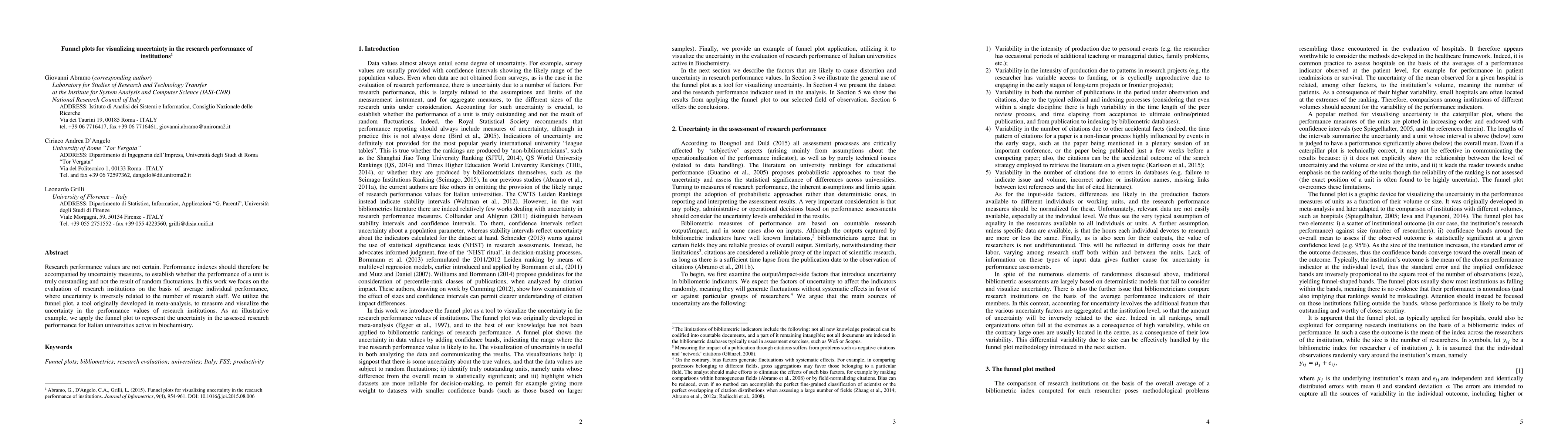 This paper proposes using funnel plots to visualize the uncertainty in research performance of institutions, arguing that performance indexes should include uncertainty measures. The authors apply this method to Italian universities in biochemistry to illustrate how funnel plots can help determine if high performance is genuine or due to random fluctuations.