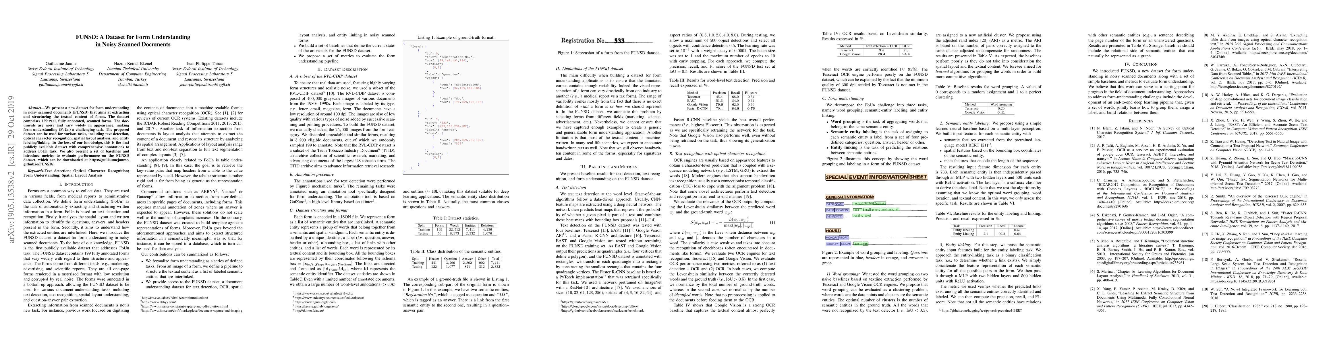 The FUNSD dataset offers 199 annotated scanned forms for form understanding tasks, including text detection and entity labeling, with baselines and evaluation metrics. It is the first publicly available dataset with comprehensive annotations for this purpose.