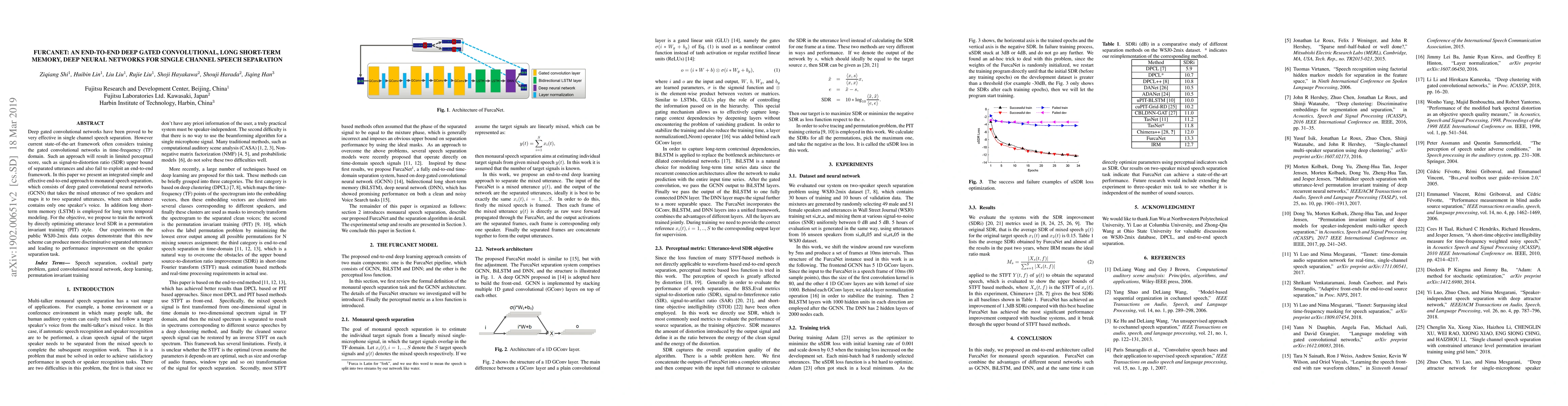FurcaNet combines deep gated convolutional networks and long short-term memory networks for end-to-end monaural speech separation, optimizing utterance-level signal-to-distortion ratio, and achieving better performance on speaker separation tasks compared to existing methods.
