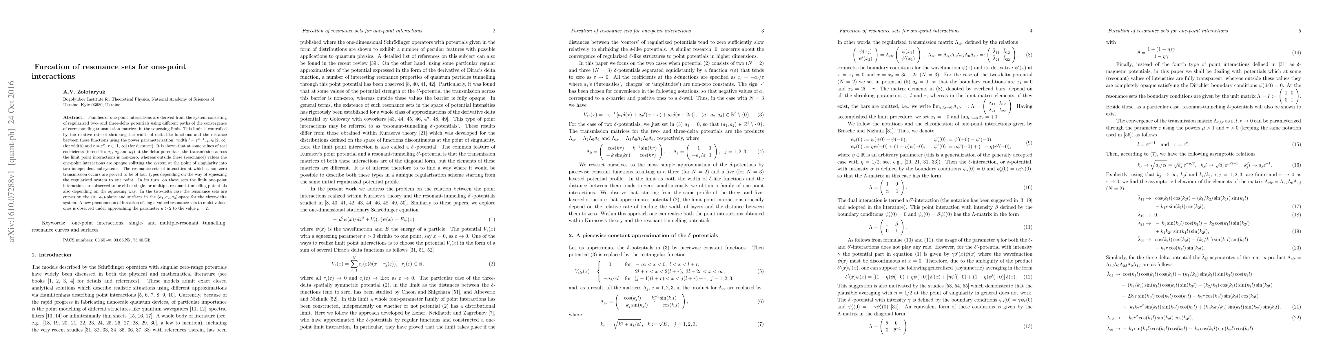 Families of one-point interactions are derived from the system consisting of regularized two- and three-delta potentials using different paths of the convergence of corresponding transmission matrices in the squeezing limit. This limit is controlled by the relative rate of shrinking the width of delta-like functions and the distance between these functions using the power parameterization: width $l =\varepsilon^{\mu -1}$, $\mu \in [2,\, \infty]$ (for width) and $r = \varepsilon^\tau$, $\tau \in [1,\, \infty]$ (for distance). It is shown that at some values of real coefficients (intensities $a_1$, $a_2$ and $a_3$) at the delta potentials, the transmission across the limit point interactions is non-zero, whereas outside these (resonance) values the one-point interactions are opaque splitting the system at the point of singularity into two independent subsystems. The resonance sets of intensities at which a non-zero transmission occurs are proved to be of four types depending on the way of squeezing the regularized system to one point. In its turn, on these sets the limit one-point interactions are observed to be either single- or multiple-resonant-tunnelling potentials also depending on the squeezing way. In the two-delta case the resonance sets are curves on the $(a_1,a_2)$-plane and surfaces in the $(a_1,a_2,a_3)$-space for the three-delta system. A new phenomenon of furcation of single-valued resonance sets to multi-valued ones is observed under approaching the parameter $\mu >2$ to the value $\mu =2$.
