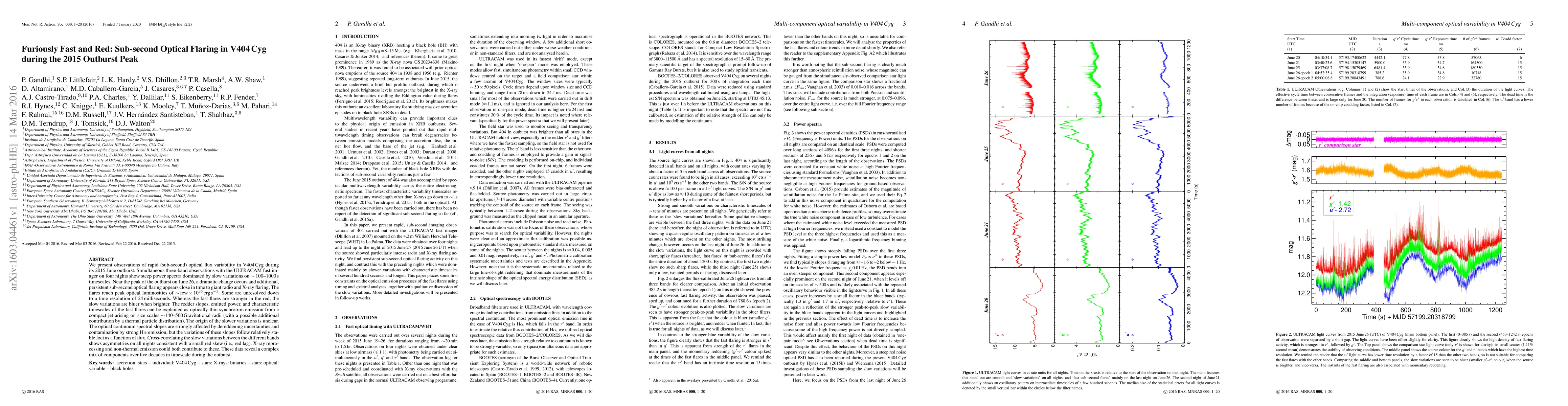 The research observes rapid sub-second optical flux variability in V404 Cyg during its 2015 outburst, identifying two types of variations: slow changes on 100-1000s timescales and fast sub-second flares near the outburst peak. Fast flares, stronger in red, are attributed to compact jet synchrotron emission, while slower variations' origin remains unclear. The study uses ULTRACAM fast imaging and finds red skew in slow variations between bands, suggesting X-ray reprocessing or non-thermal emission contributions.
