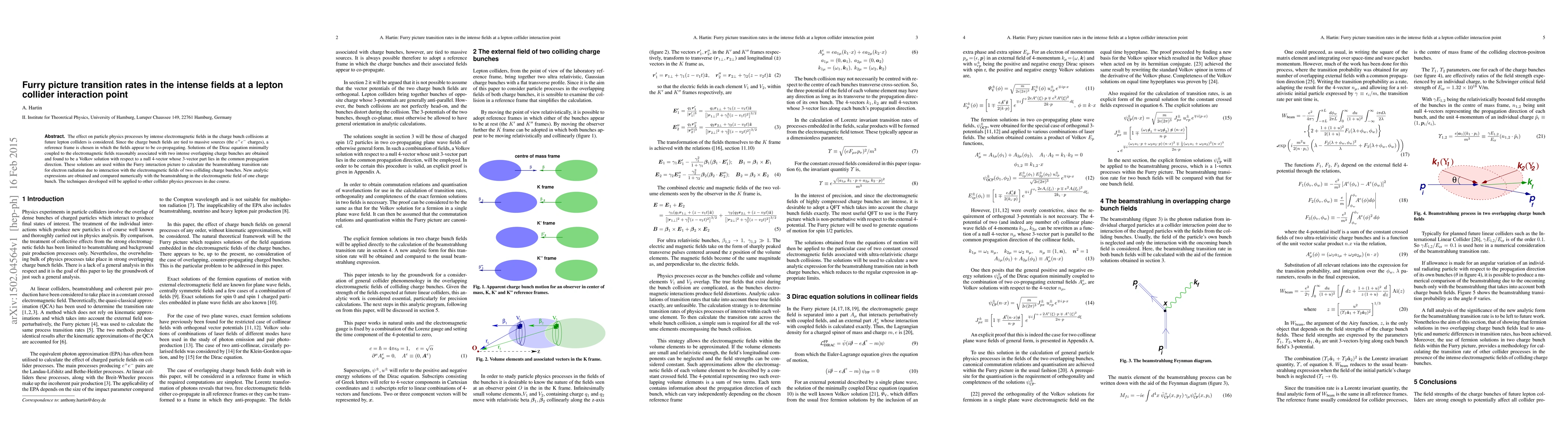 The effect on particle physics processes by intense electromagnetic fields in the charge bunch collisions at future lepton colliders is considered. Since the charge bunch fields are tied to massive sources (the $e^{+}e^{-}$ charges), a reference frame is chosen in which the fields appear to be co-propagating. Solutions of the Dirac equation minimally coupled to the electromagnetic fields reasonably associated with two intense overlapping charge bunches are obtained and found to be a Volkov solution with respect to a null 4-vector whose 3-vector part lies in the common propagation direction. These solutions are used within the Furry interaction picture to calculate the beamstrahlung transition rate for electron radiation due to interaction with the electromagnetic fields of two colliding charge bunches. New analytic expressions are obtained and compared numerically with the beamstrahlung in the electromagnetic field of one charge bunch. The techniques developed will be applied to other collider physics processes in due course.