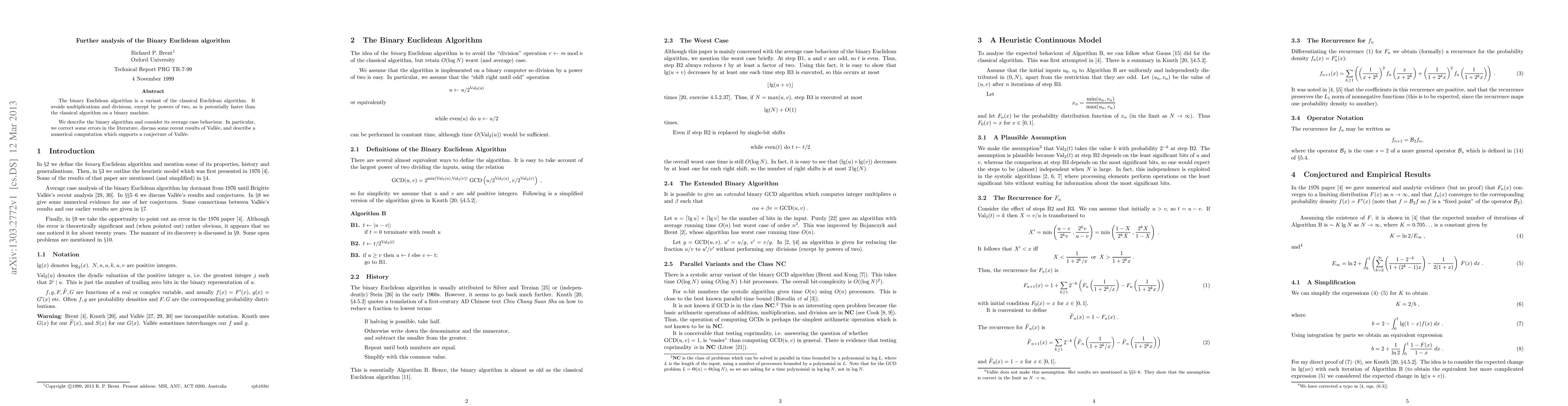 Researchers analyzed the binary Euclidean algorithm, a variant of the classical algorithm that avoids multiplications and divisions to reduce computation time. They corrected errors in previous literature and provided numerical evidence supporting a conjecture about its average-case behavior.