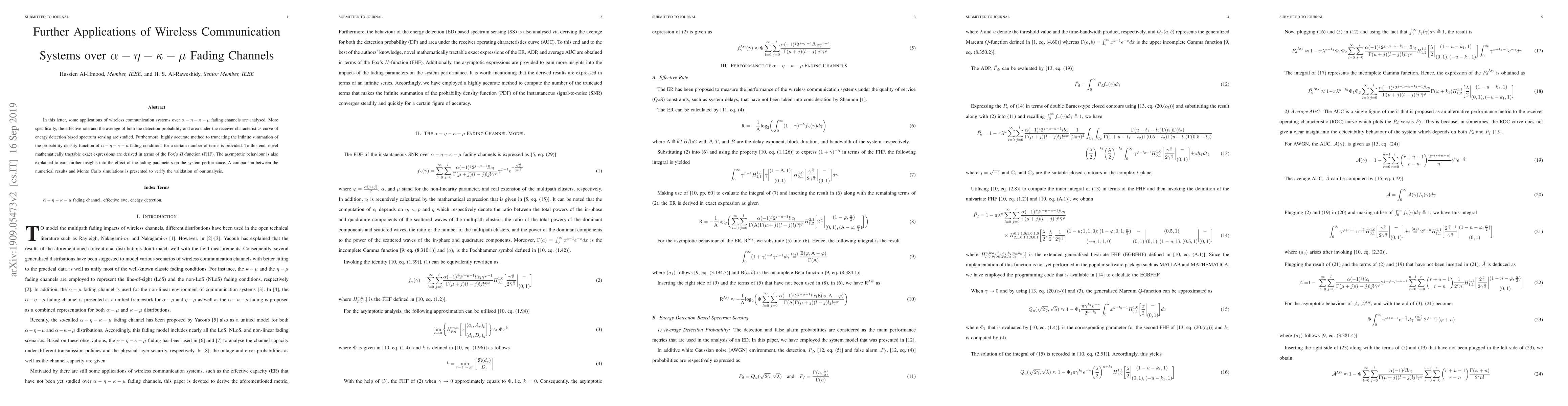 In this letter, some applications of wireless communication systems over $\alpha-\eta-\kappa-\mu$ fading channels are analysed. More specifically, the effective rate and the average of both the detection probability and area under the receiver characteristics curve of energy detection based spectrum sensing are studied. Furthermore, highly accurate method to truncating the infinite summation of the probability density function of $\alpha-\eta-\kappa-\mu$ fading conditions for a certain number of terms is provided. To this end, novel mathematically tractable exact expressions are derived in terms of the Fox's $H$-function (FHF). The asymptotic behaviour is also explained to earn further insights into the effect of the fading parameters on the system performance. A comparison between the numerical results and Monte Carlo simulations is presented to verify the validation of our analysis.
