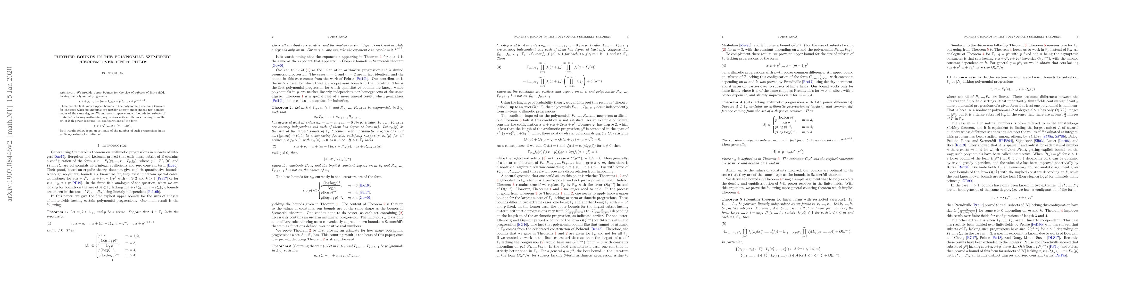 This research paper establishes upper bounds for subsets of finite fields without certain polynomial progressions, improving known results in the field of Szemeredi's theorem.