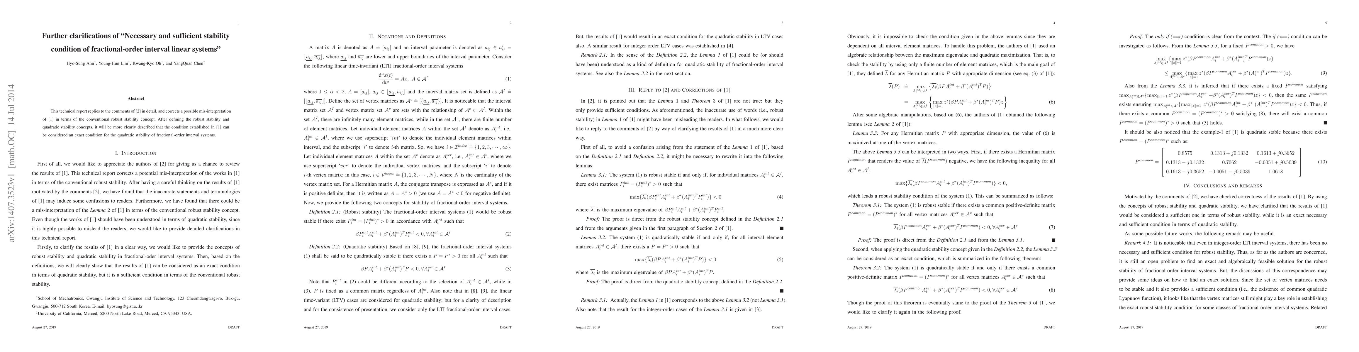 This technical report replies to the comments of [2] in detail, and corrects a possible mis-interpretation of [1] in terms of the conventional robust stability concept. After defining the robust stability and quadratic stability concepts, it will be more clearly described that the condition established in [1] can be considered an exact condition for the quadratic stability of fractional-order interval systems.