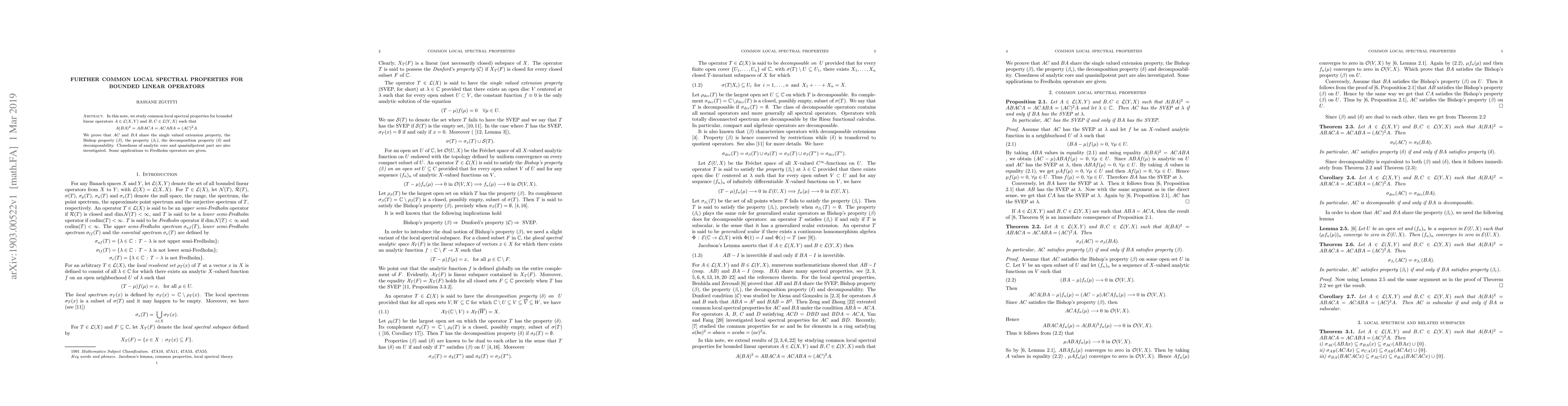 This research explores common spectral properties of bounded linear operators A, B, and C under specific conditions, proving shared properties like single valued extension, Bishop property, decomposition property, and decomposability. It also examines the closedness of analytic core and quasinilpotent part, with applications to Fredholm operators.
