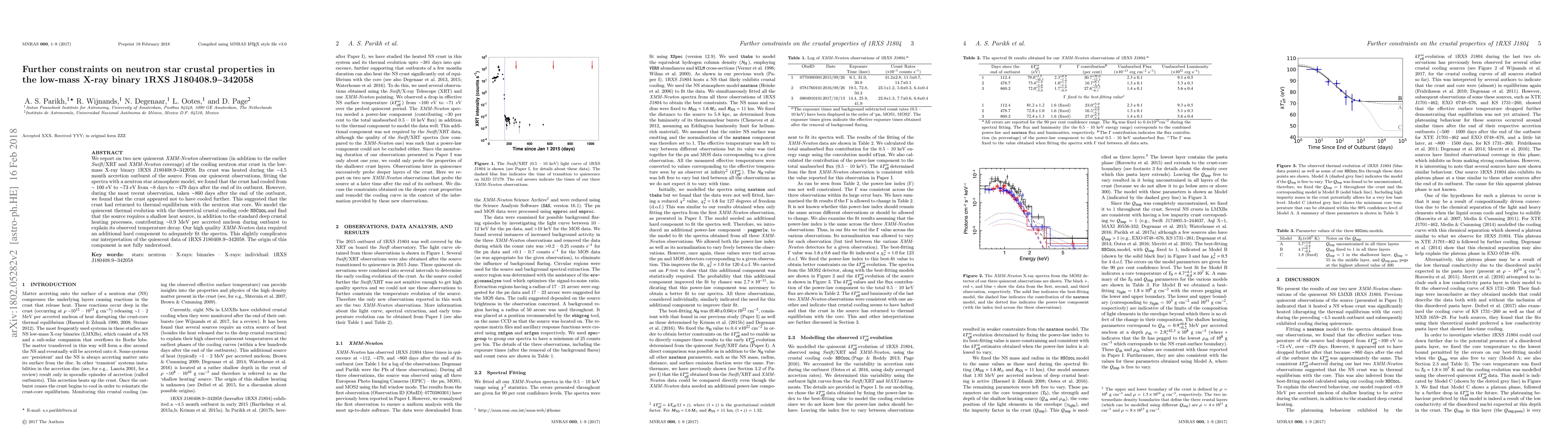 The study analyzes quiescent XMM-Newton observations of the low-mass X-ray binary 1RXS J180408.9$-$342058, finding its neutron star crust cooled from ~100 eV to ~73 eV over 479 days post-outburst, but stabilized at ~73 eV after 860 days, indicating thermal equilibrium with the core. The cooling model NSCool suggests a shallow heat source, in addition to standard processes, contributes ~0.9 MeV per accreted nucleon during outburst. High-quality XMM-Newton data also revealed an extra hard component in spectra, whose origin remains unclear.