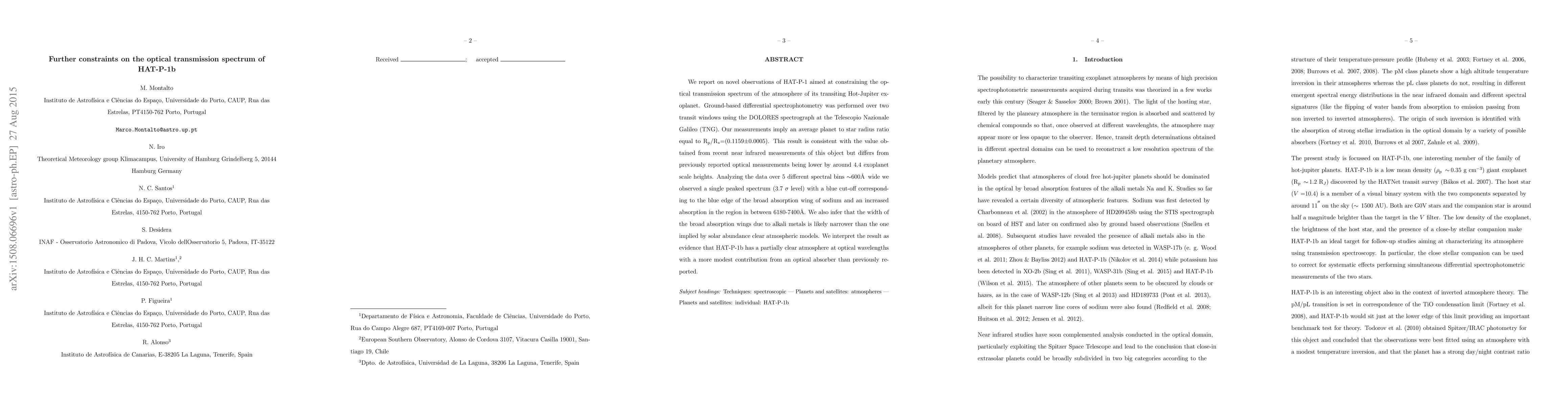 We report on novel observations of HAT-P-1 aimed at constraining the optical transmission spectrum of the atmosphere of its transiting Hot-Jupiter exoplanet. Ground-based differential spectrophotometry was performed over two transit windows using the DOLORES spectrograph at the Telescopio Nazionale Galileo (TNG). Our measurements imply an average planet to star radius ratio equal to $\rm R_p/R_{\star}$=(0.1159$\pm$0.0005). This result is consistent with the value obtained from recent near infrared measurements of this object but differs from previously reported optical measurements being lower by around 4.4 exoplanet scale heights. Analyzing the data over 5 different spectral bins 600\AA$\,$ wide we observed a single peaked spectrum (3.7 $\rm\sigma$ level) with a blue cut-off corresponding to the blue edge of the broad absorption wing of sodium and an increased absorption in the region in between 6180-7400\AA. We also infer that the width of the broad absorption wings due to alkali metals is likely narrower than the one implied by solar abundance clear atmospheric models. We interpret the result as evidence that HAT-P-1b has a partially clear atmosphere at optical wavelengths with a more modest contribution from an optical absorber than previously reported.