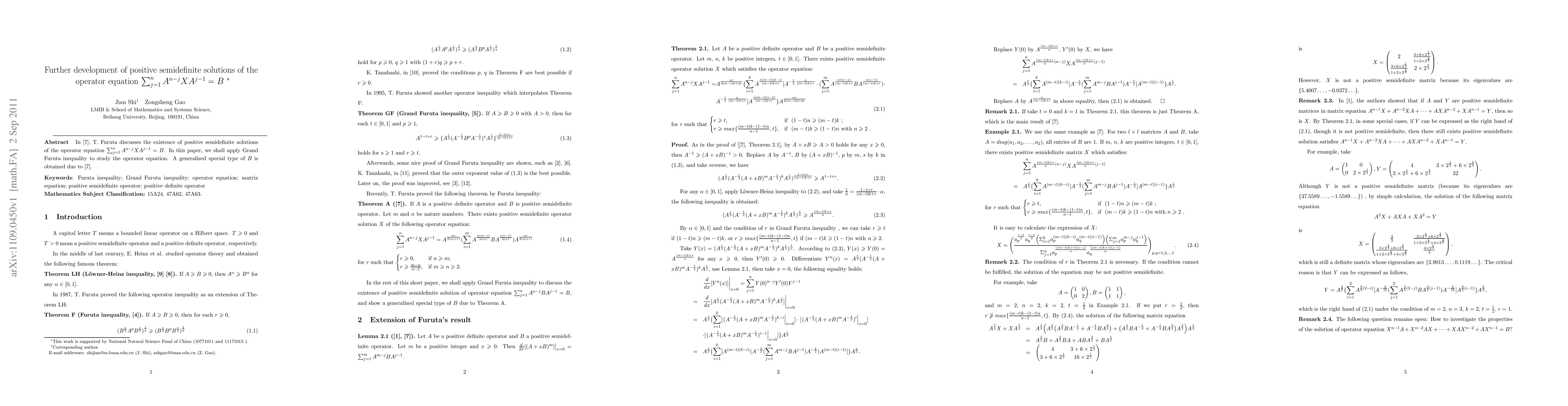 In \cite{Positive semidefinite solutions}, T. Furuta discusses the existence of positive semidefinite solutions of the operator equation $\sum_{j=1}^{n}A^{n-j}XA^{j-1}=B$. In this paper, we shall apply Grand Furuta inequality to study the operator equation. A generalized special type of $B$ is obtained due to \cite{Positive semidefinite solutions}.
