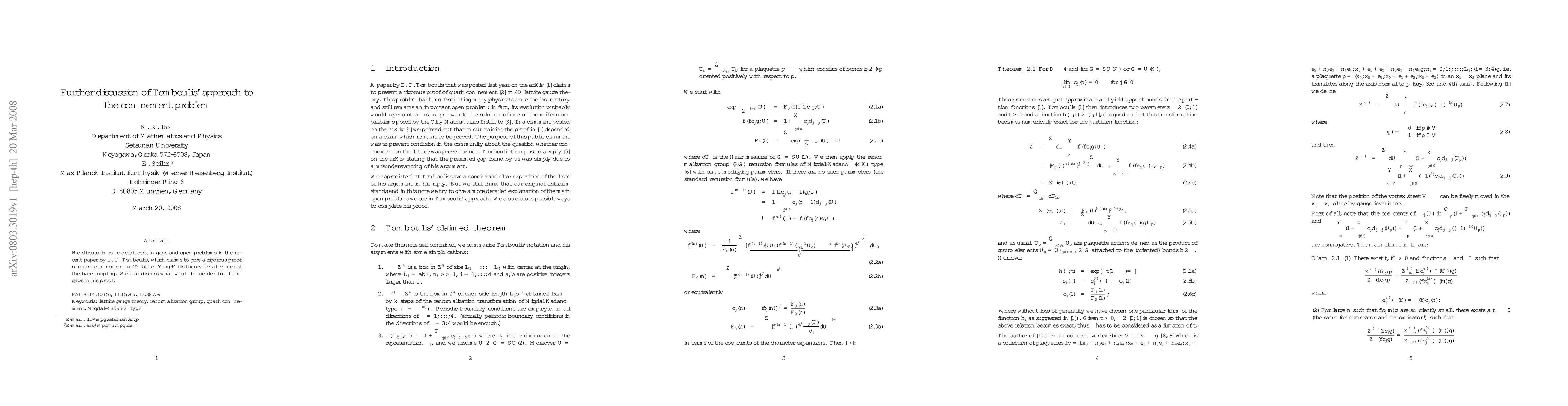 We discuss in some detail certain gaps and open problems in the recent paper by E. T. Tomboulis, which claims to give a rigorous proof of quark confinement in 4D lattice Yang-Mills theory for all values of the bare coupling. We also discuss what would be needed to fill the gaps in his proof.