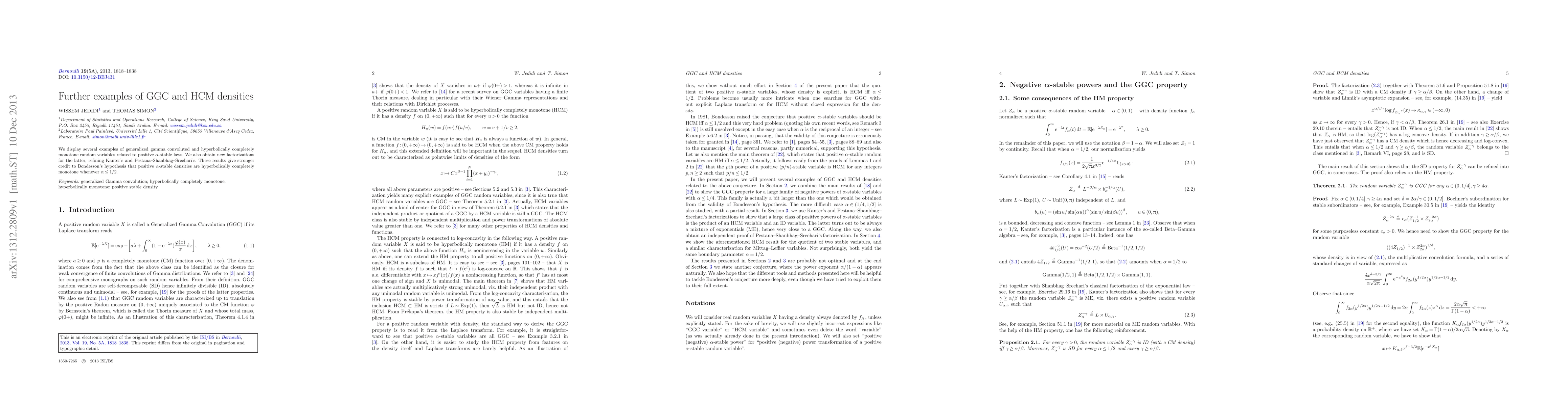 We display several examples of generalized gamma convoluted and hyperbolically completely monotone random variables related to positive $\alpha$-stable laws. We also obtain new factorizations for the latter, refining Kanter's and Pestana-Shanbhag-Sreehari's. These results give stronger credit to Bondesson's hypothesis that positive $\alpha$-stable densities are hyperbolically completely monotone whenever $\alpha\le1/2.$