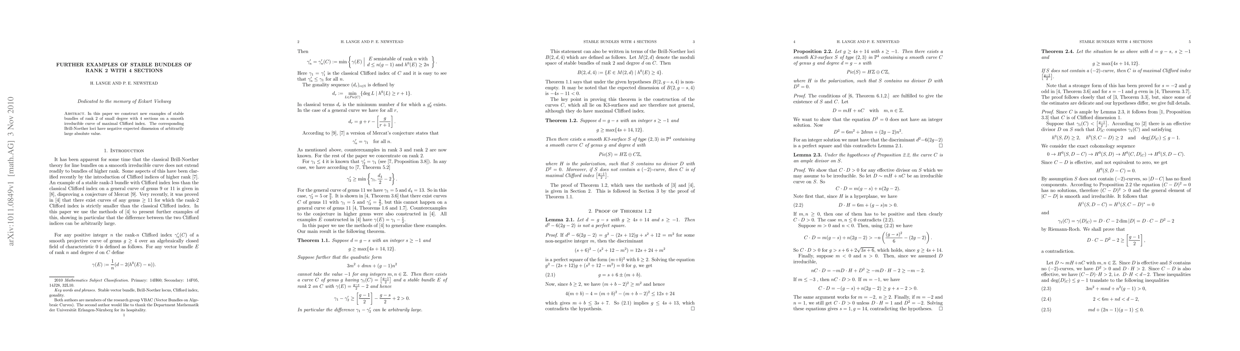 In this paper we construct new examples of stable bundles of rank 2 of small degree with 4 sections on a smooth irreducible curve of maximal Clifford index. The corresponding Brill-Noether loci have negative expected dimension of arbitrarily large absolute value.