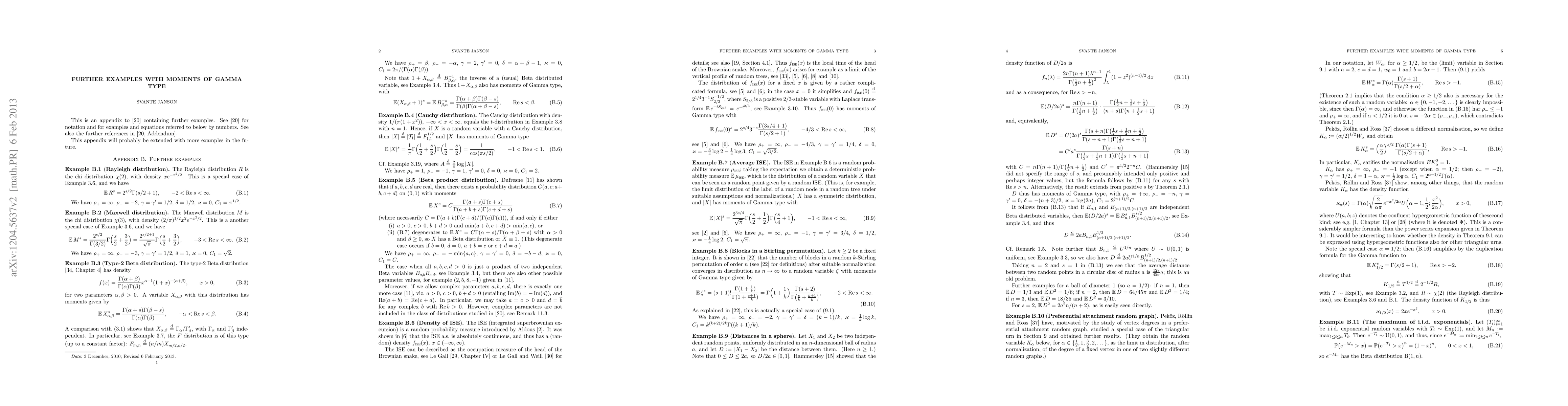 This is an appendix containing further examples to S. Janson, Moments of Gamma type and the Brownian supremum process area, arXiv:1002.4135 [math.PR] and Probability Surveys 7 (2010), 1-52.