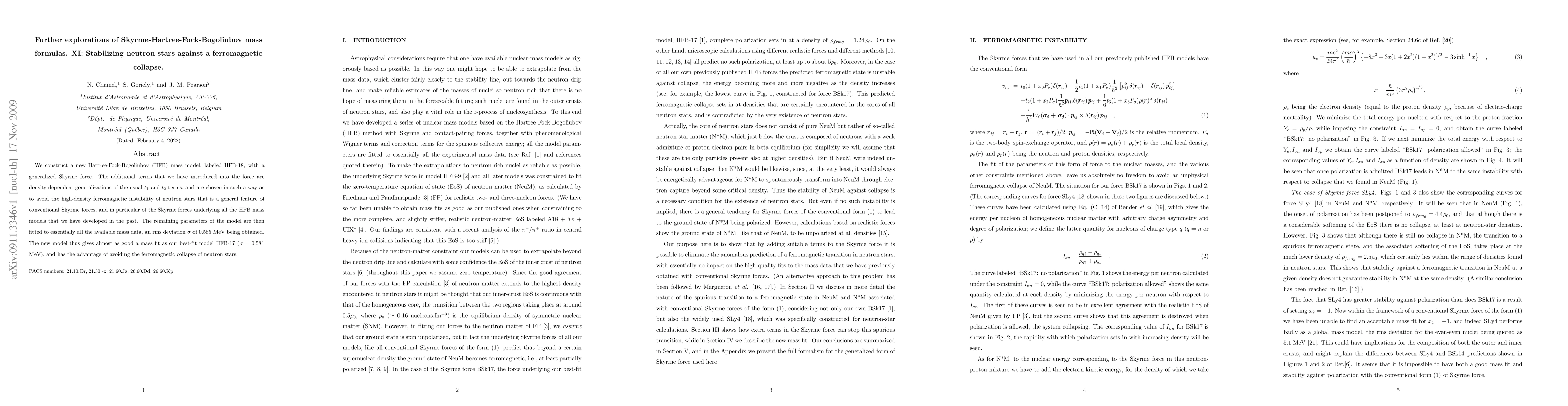 This paper introduces a new Hartree-Fock-Bogoliubov mass model, HFB-18, with a generalized Skyrme force that includes density-dependent terms to prevent the high-density ferromagnetic instability in neutron stars, achieving a mass fit with an rms deviation of 0.585 MeV, comparable to previous models but without the instability issue.