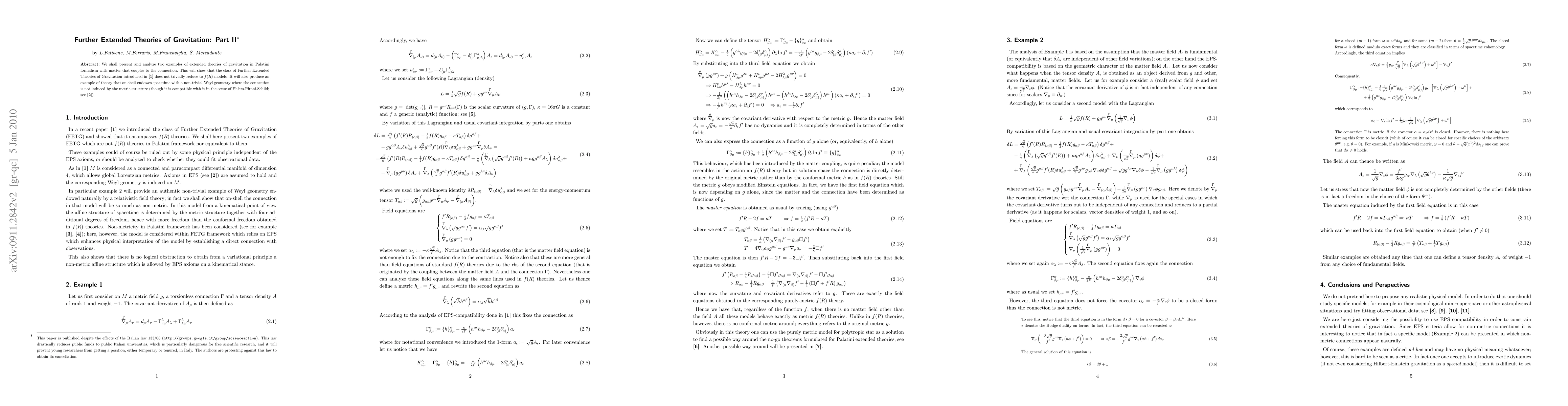 We shall present and analyze two examples of extended theories of gravitation in Palatini formalism with matter that couples to the connection. This will show that the class of Further Extended Theories of Gravitation introduced in ref. [1] does not trivially reduce to f(R) models. It will also produce an example of theory that on-shell endowes spacetime with a non-trivial Weyl geometry where the connection is not induced by the metric structure (though it is compatible with it in the sense of Ehlers-Pirani-Schild; see ref. [2]).