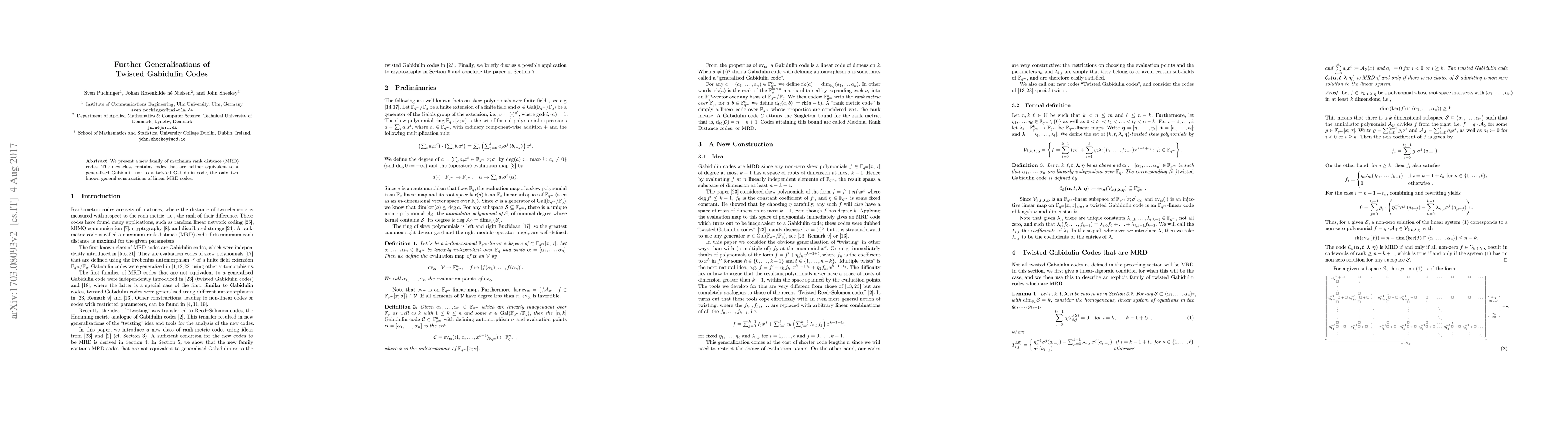 This paper introduces a novel family of maximum rank distance (MRD) codes that extend beyond existing constructions of generalised and twisted Gabidulin codes, offering new linear MRD codes with unique properties.