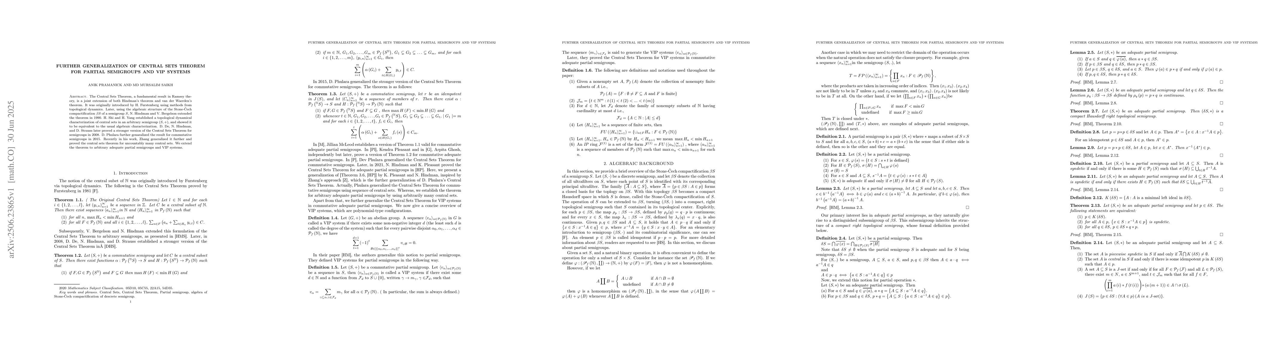 The Central Sets Theorem, a fundamental result in Ramsey theory, is a joint extension of both Hindman's theorem and van der Waerden's theorem. It was originally introduced by H. Furstenberg using methods from topological dynamics. Later, using the algebraic structure of the Stone-$\v{C}$ech compactification $\beta$ S of a semigroup S, N. Hindman and V. Bergelson extended the theorem in 1990. H. Shi and H. Yang established a topological dynamical characterization of central sets in an arbitrary semigroup (S,+), and showed it to be equivalent to the usual algebraic characterization. D. De, N. Hindman, and D. Strauss later proved a stronger version of the Central Sets Theorem for semigroups in 2008. D. Phulara further genaralized the result for commutative semigroups in 2015. Recently in his work, Zhang generalized it further and proved the central sets theorem for uncountably many central sets. We extend the theorem to arbitrary adequate partial semigroups and VIP systems.