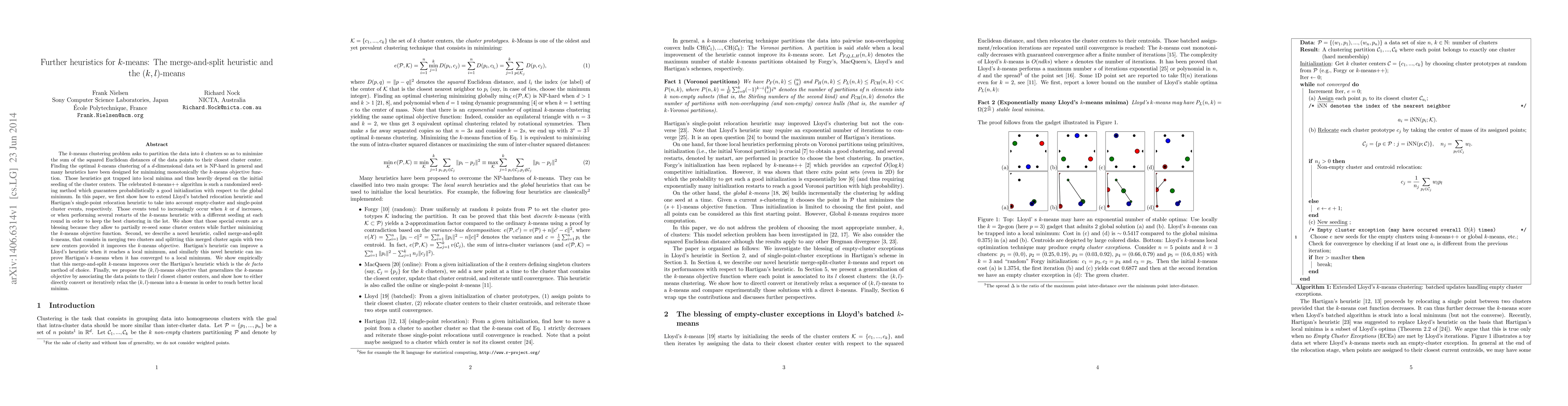 This paper introduces enhancements to the $k$-means clustering algorithm, including extensions of existing heuristics to handle empty-cluster and single-point cluster events. It proposes a novel merge-and-split heuristic that merges and splits clusters to improve the $k$-means objective, outperforming Hartigan's heuristic. Additionally, it presents the $(k,l)$-means objective, which generalizes $k$-means by assigning points to their $l$ closest centers, and discusses methods to convert it into a $k$-means for better local minima.