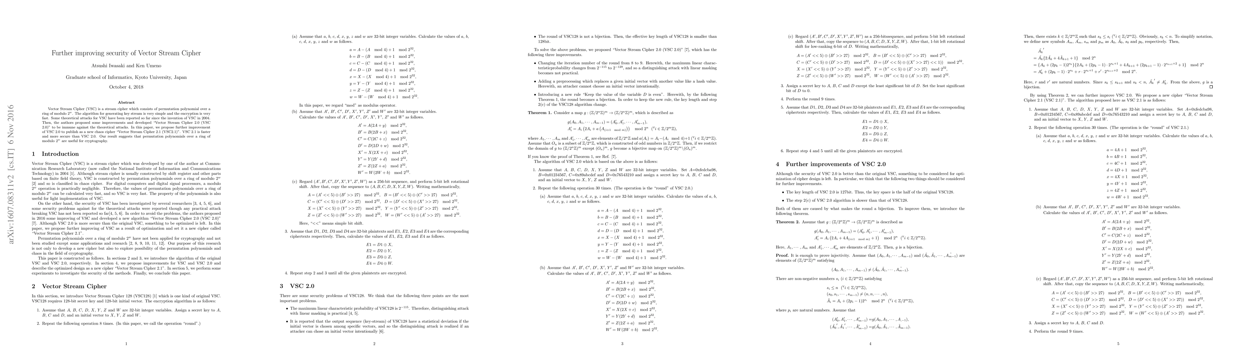The paper proposes improvements to Vector Stream Cipher (VSC) 2.0, introducing Vector Stream Cipher 2.1 (VSC2.1), by modifying the round function and key scheduling to enhance security and efficiency.