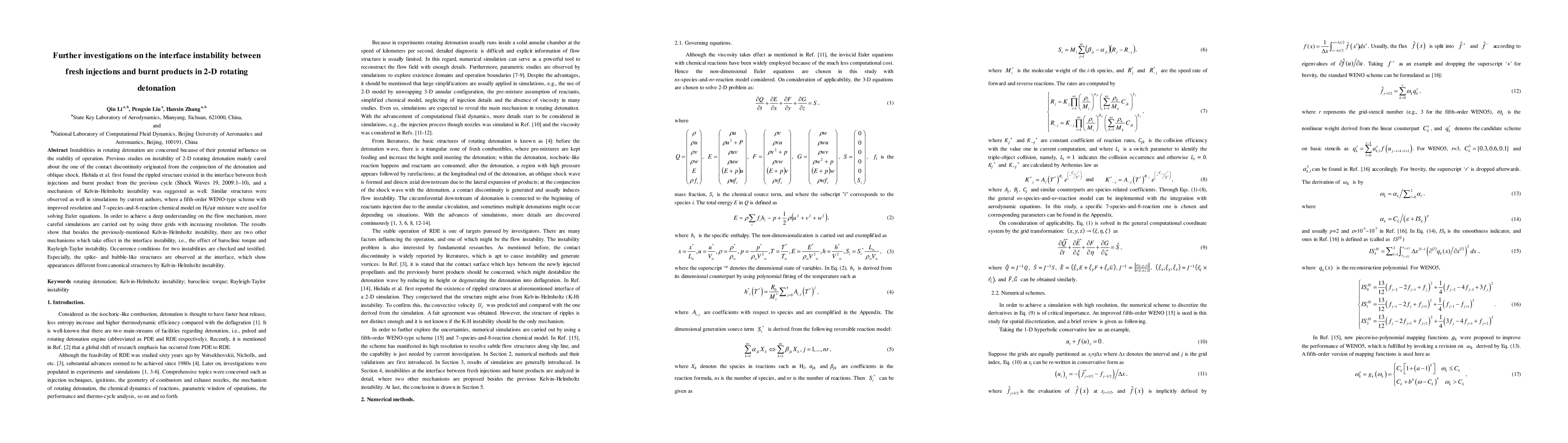 Instabilities in rotating detonation are concerned because of their potential influence on the stability of operation. Previous studies on instability of 2-D rotating detonation mainly cared about the one of the contact discontinuity originated from the conjunction of the detonation and oblique shock. Hishida et al. first found the rippled structure existed in the interface between fresh injections and burnt product from the previous cycle (Shock Waves 19, 2009), and a mechanism of Kelvin-Helmholtz instability was suggested as well. Similar structures were observed as well in simulations by current authors, where a fifth-order WENO-type scheme with improved resolution and 7-species-and-8-reaction chemical model were used. In order to achieve a deep understanding on the flow mechanism, more careful simulations are carried out by using three grids with increasing resolution. The results show that besides the previously-mentioned Kelvin-Helmholtz instability, there are two other mechanisms which take effect in the interface instability, i.e., the effect of baroclinic torque and Rayleigh-Taylor instability. Occurrence conditions for two instabilities are checked and testified. Especially, the spike- and bubble-like structures are observed at the interface, which show appearances different from canonical structures by Kelvin-Helmholtz instability.