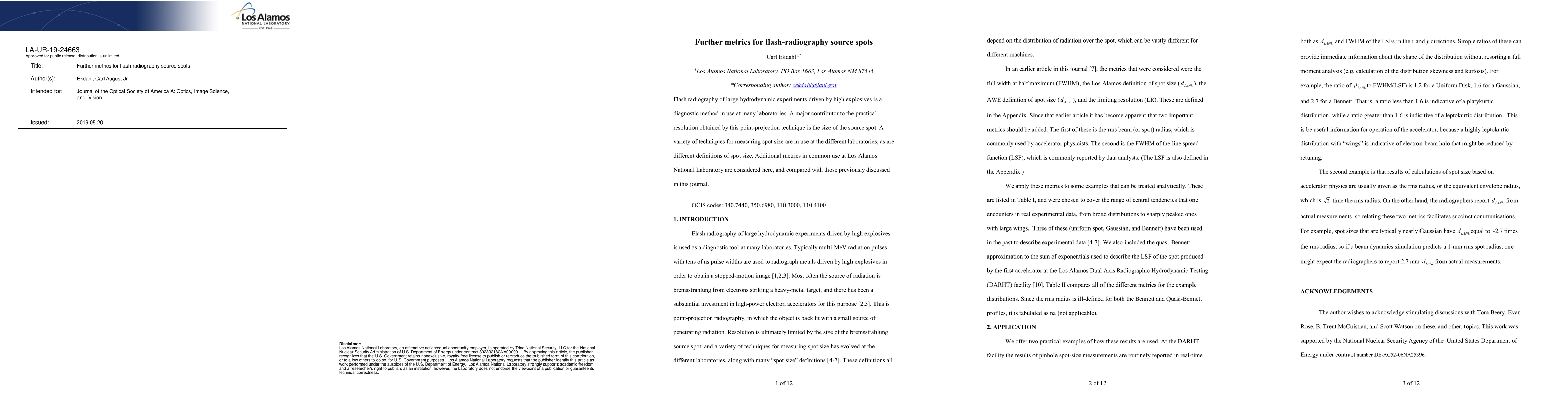 Flash radiography of large hydrodynamic experiments driven by high explosives is a diagnostic method in use at many laboratories. A major contributor to the practical resolution obtained by this point-projection technique is the size of the source spot. A variety of techniques for measuring spot size are in use at the different laboratories, as are different definitions of spot size. Additional metrics in common use at Los Alamos National Laboratory are considered here, and compared with those previously discussed in J. Opt. Soc.