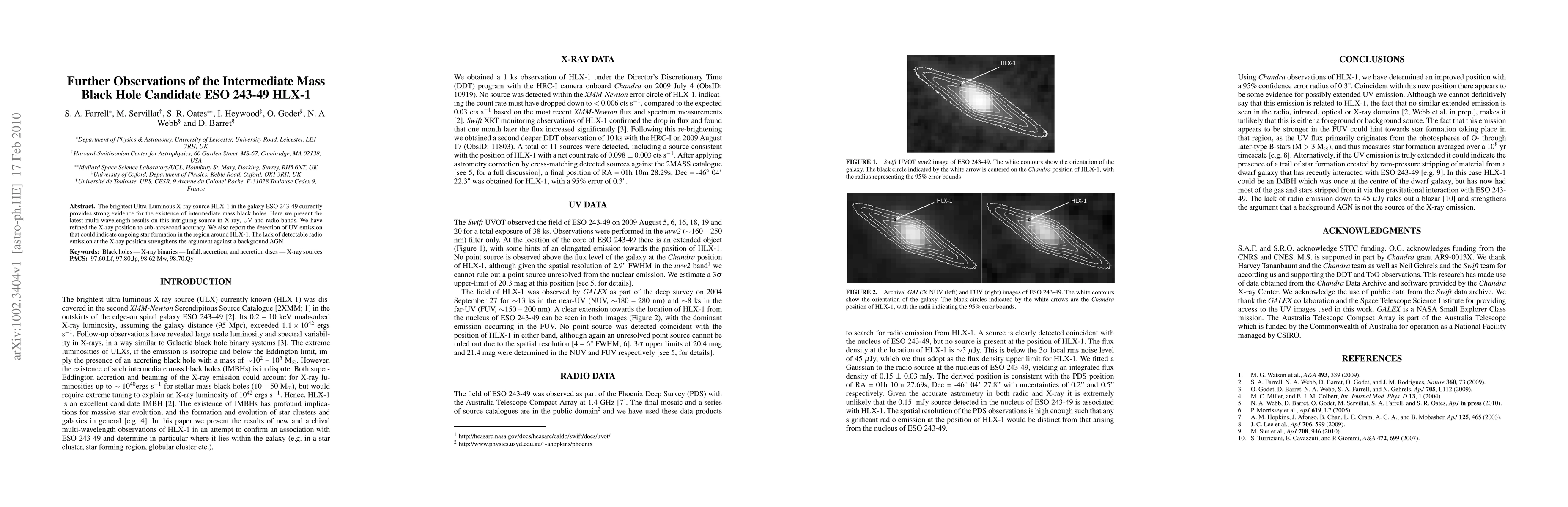 New observations of HLX-1 reveal refined X-ray position and UV emission, strengthening the case for an intermediate mass black hole candidate in galaxy ESO 243-49. The lack of detectable radio emission supports this theory.